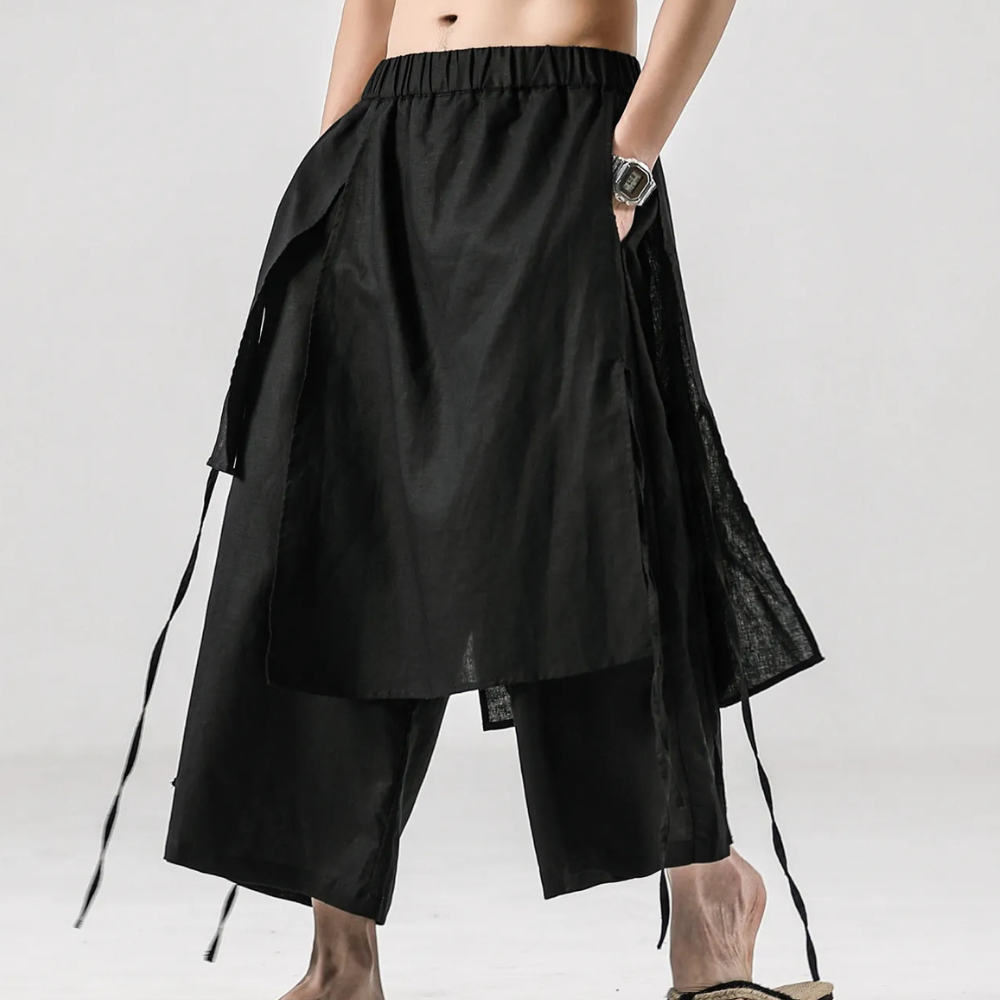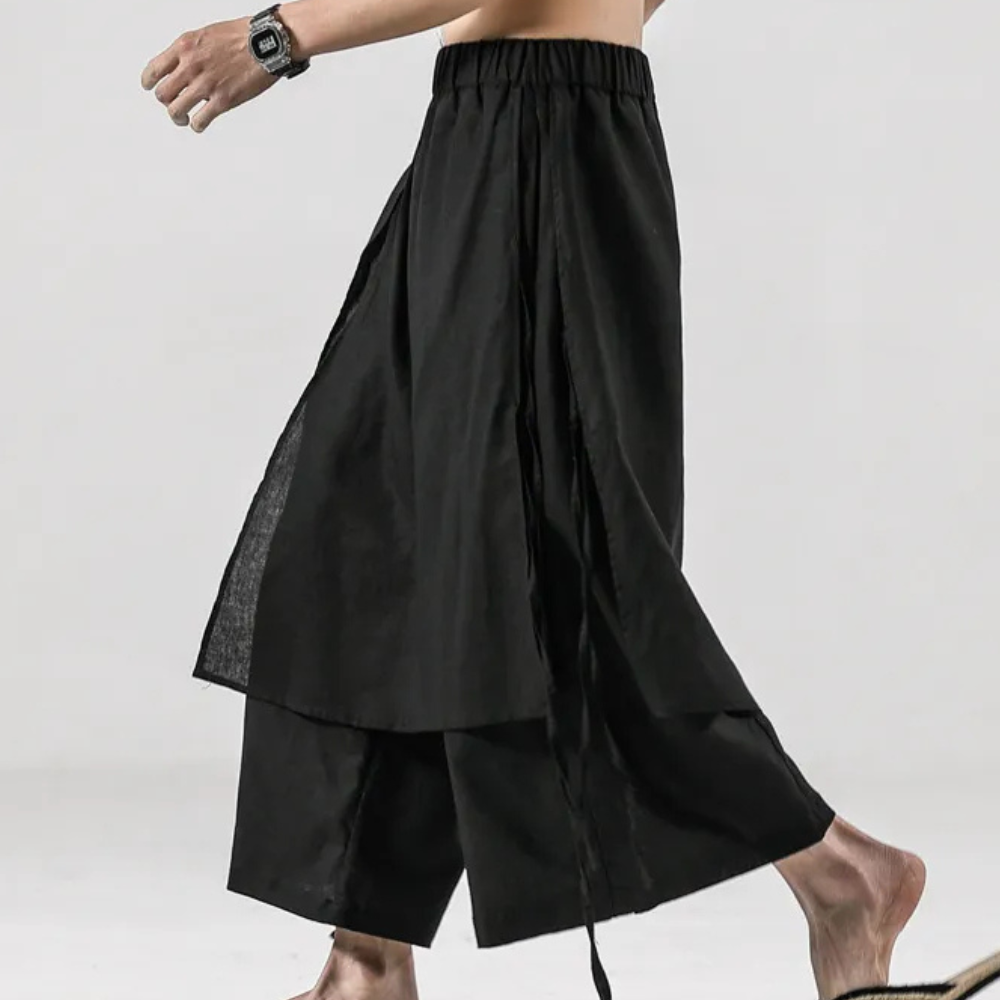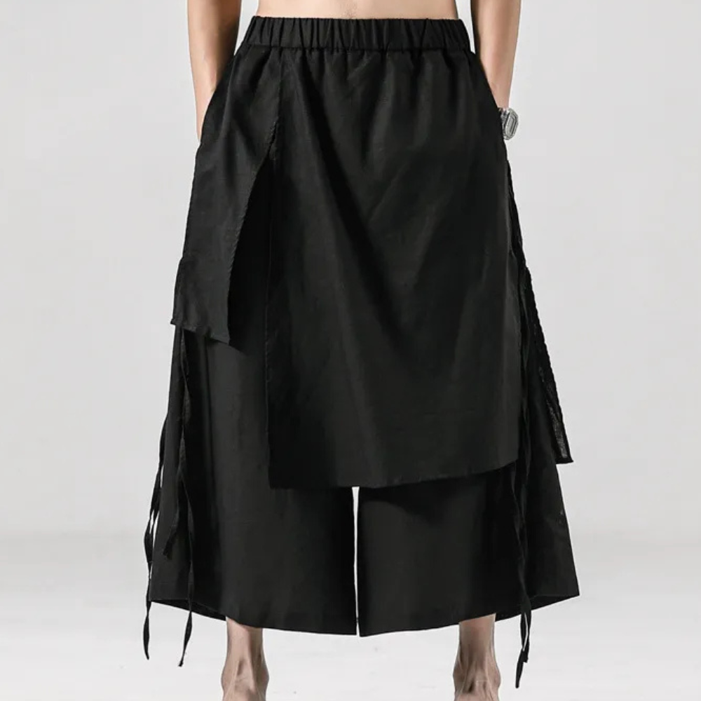 ELIJAH - Luxe Broeken voor Heren bieden een vernieuwende benadering van traditionele broeken, met een gedurfde, ongelijkmatige snit die een unieke flair aan je garderobe toevoegt.