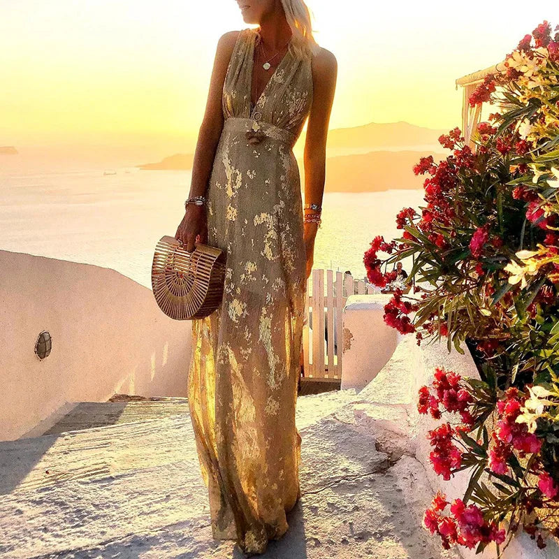 De Albina - Vloeiende V-hals jurk met paillettenversiering heeft een V-halslijn en lijkt gemaakt te zijn van een lichte, vloeiende stof, ideaal voor warm weer en buitenomgevingen. De kleurencombinatie van blauw en geel is verfrissend en doet denken aan zonnige luchten en bloeiende bloemen. De losse pasvorm van de jurk suggereert comfort en bewegingsvrijheid, terwijl het patroon een vrouwelijke en speelse touch toevoegt.