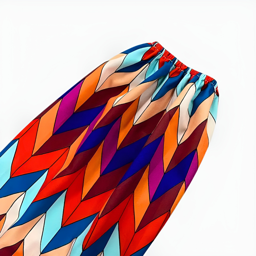Deze jurk toont een levendige charme met zijn gedurfde geometrische patronen. Gemaakt van luxe stof, heeft deze jurk gepofte mouwen en een getailleerde taillelijn, waardoor een modieus stuk ontstaat dat perfect is voor alle gelegenheden.
