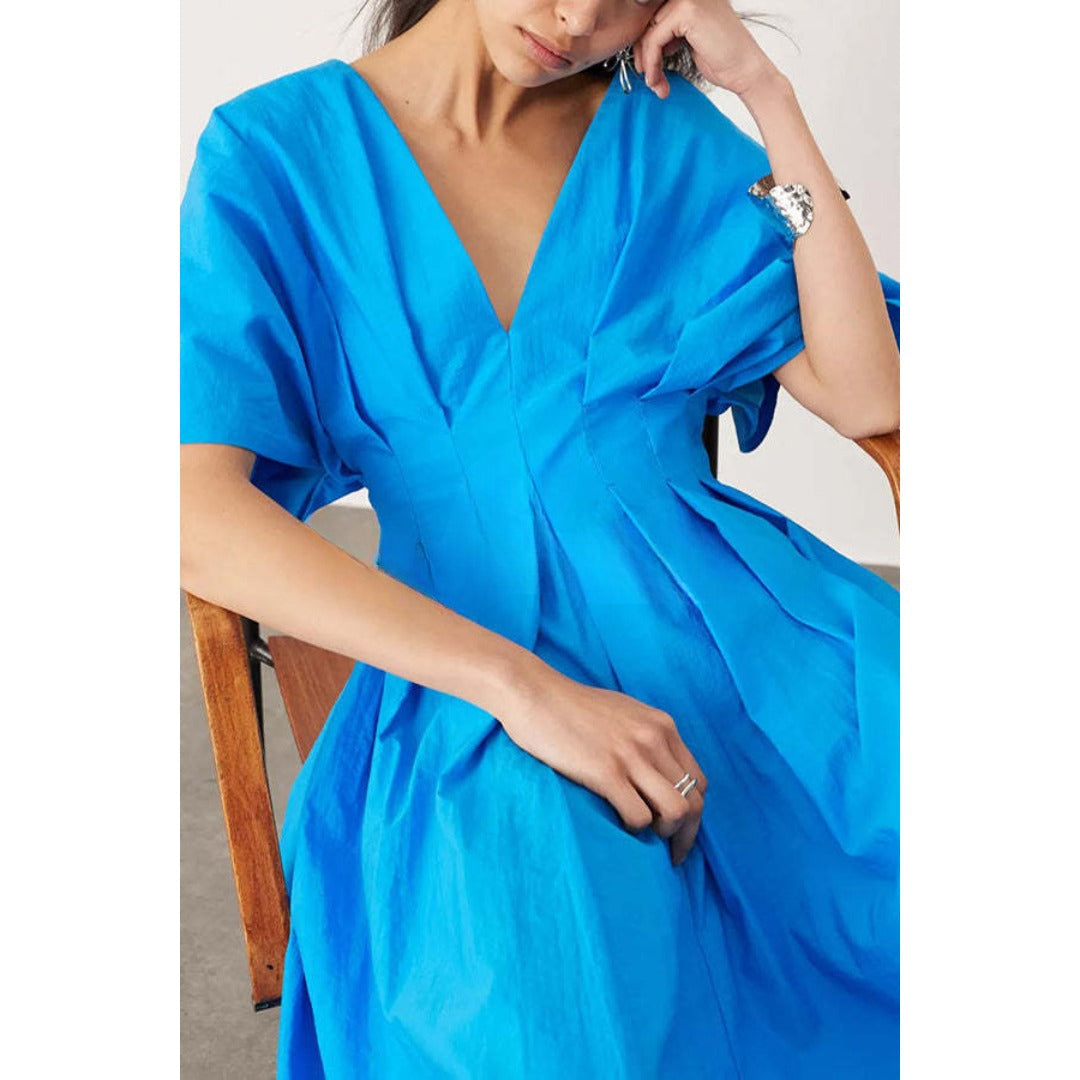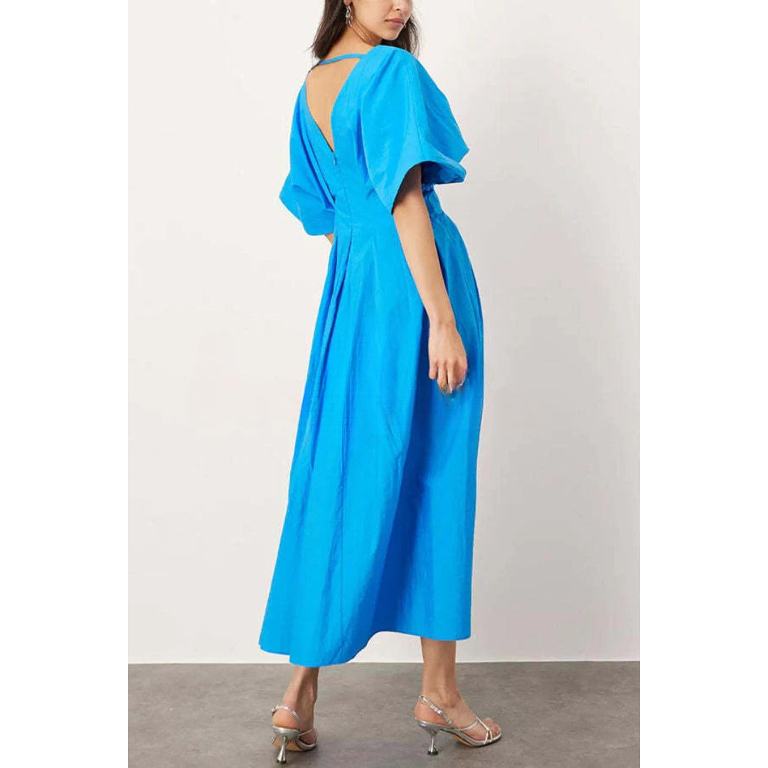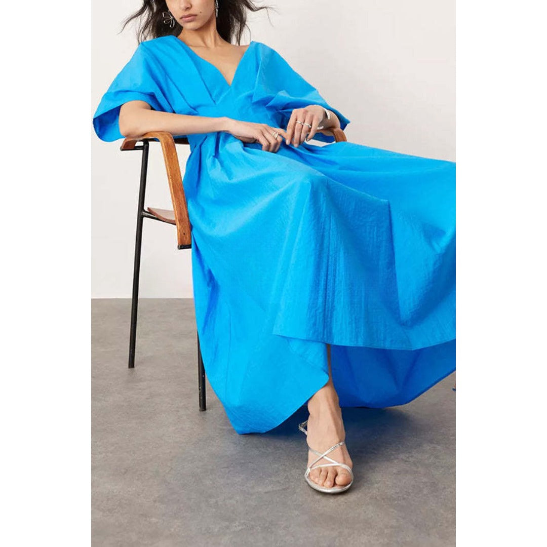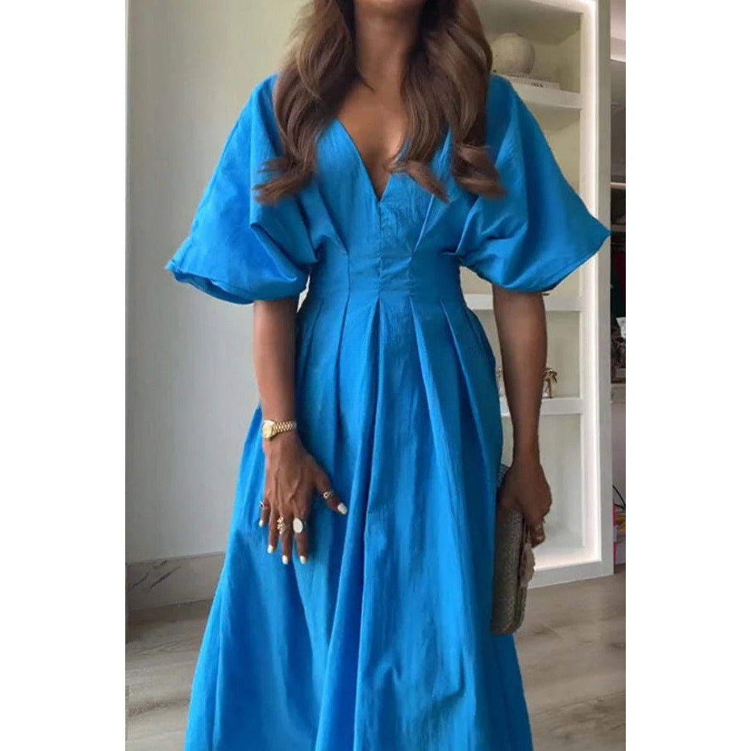 De Anita-formele jurk biedt een balans tussen stijl en comfort, perfect voor vrouwen die er verzorgd uit willen zien zonder in te boeten op bewegingsvrijheid. De jurk heeft een elegante V-hals en flatterende brede pofmouwen, waardoor hij geschikt is voor een breed scala aan gelegenheden, van informele bijeenkomsten tot avondjes uit.