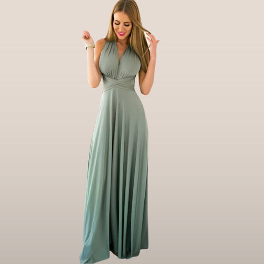 Ayla is een elegante lange jurk met een haltertop die overloopt in een open rug met gekruiste bandjes. De soepele stof valt mooi langs het lichaam en benadrukt de taille met een strikdetail op de rug. Perfect voor bruiloften, zomerse avonden of feestelijke gelegenheden.