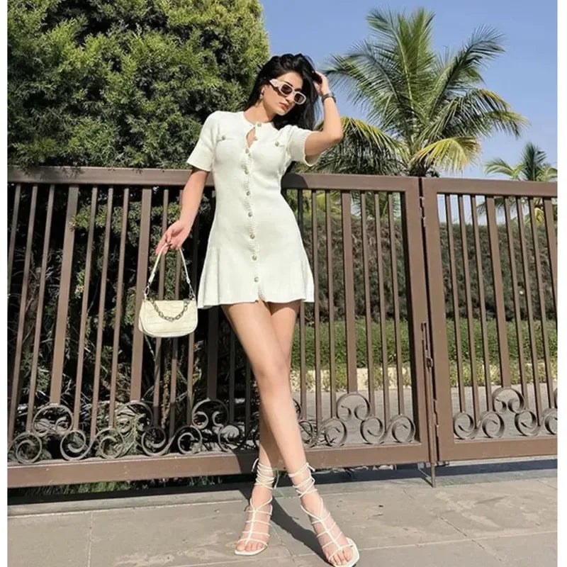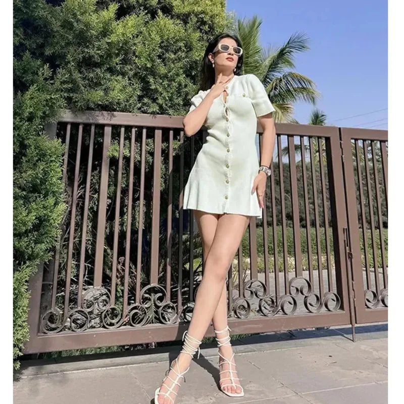 Dit verfijnde stuk is gemaakt van een luxe breisel versierd met fonkelende gouden knopen die een vleugje glamour toevoegen aan het klassieke ontwerp. Deze jurk is perfect voor overdag of 's avonds en combineert tijdloze elegantie met moderniteit.