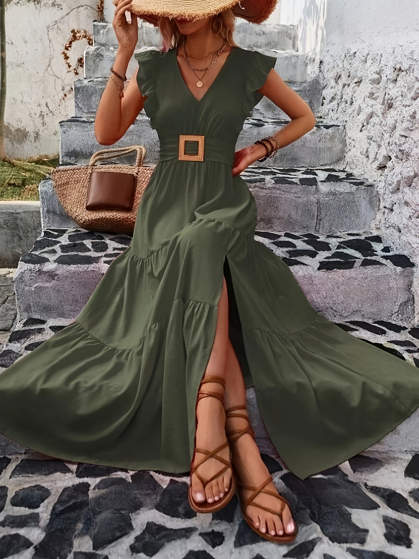 Deze vrouwelijke maxi jurk met een elegante V-hals en speelse ruches biedt zowel stijl als comfort. Het luchtige ontwerp maakt het een ideale keuze voor warmere dagen, terwijl de flatterende pasvorm je figuur mooi accentueert. De charmante details, zoals de sierlijke ruffles en het hoge split, geven je een zelfverzekerde uitstraling. Voeg deze tijdloze jurk toe aan je collectie bij Mowa-Mode!