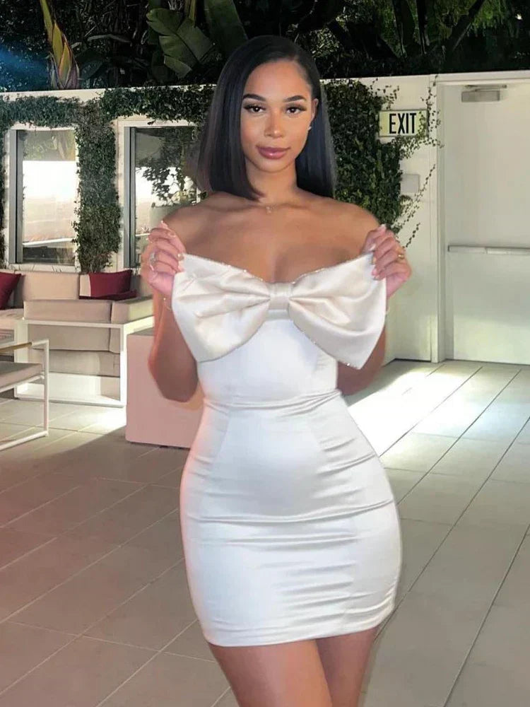 Deze prachtige satijnen strapless jurk straalt elegantie uit dankzij de gladde, glanzende stof en chique strik. Het strapless ontwerp benadrukt de schouders en het decolleté, terwijl de strik een vleugje speelse verfijning toevoegt. Deze jurk is perfect voor speciale gelegenheden of avondjes uit en combineert tijdloze glamour met moderne charme.