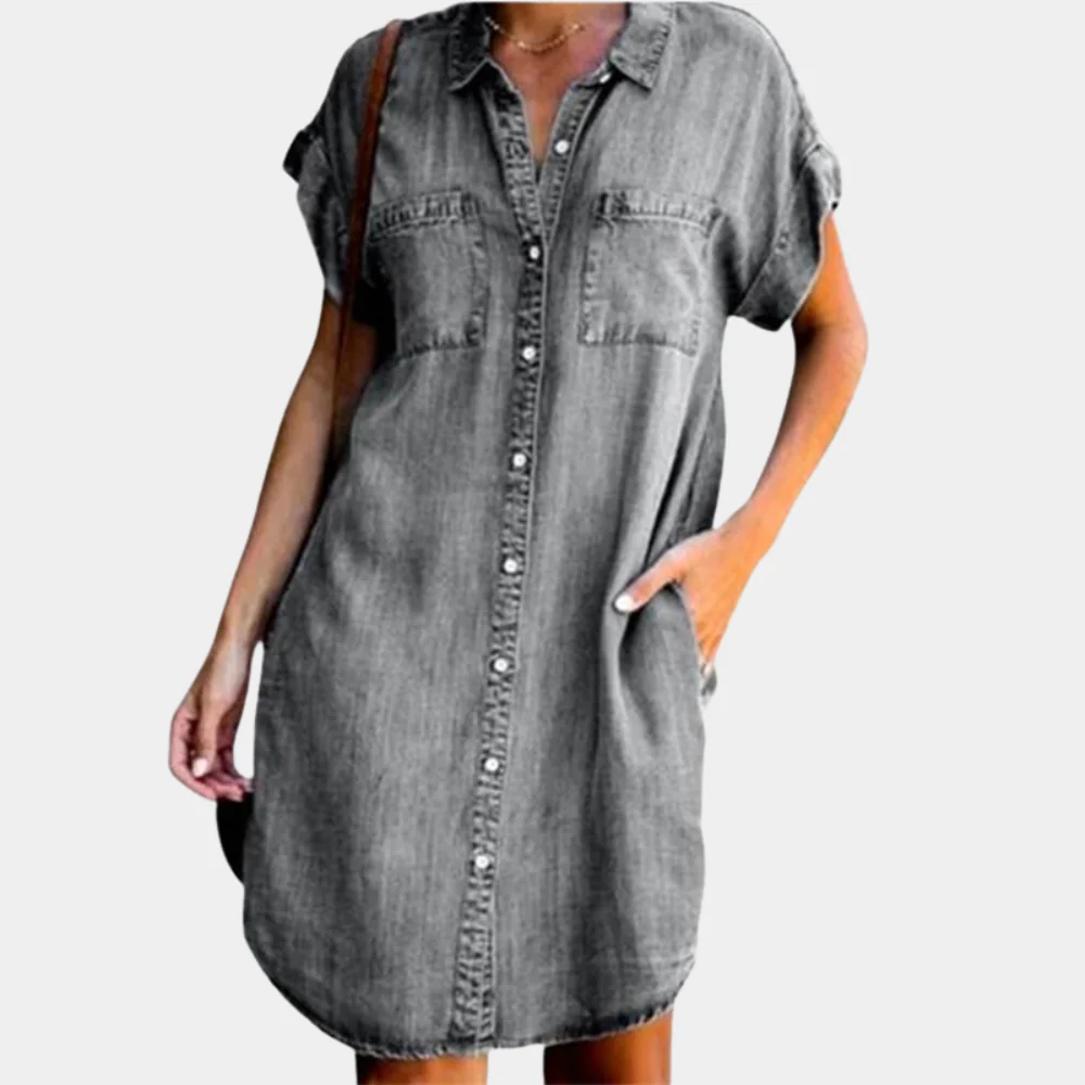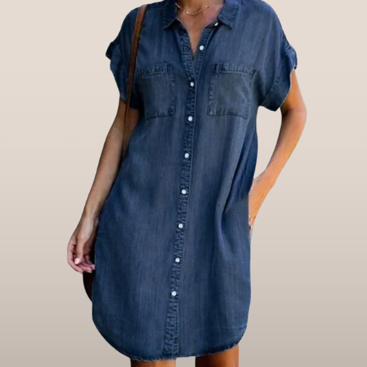 De Fenna blousejurk combineert casual comfort met een tijdloze denim look. De lichte spijkerstof en de relaxte pasvorm maken deze jurk ideaal voor dagelijks gebruik. Dankzij de knoopsluiting en borstzakken heeft het een speelse, maar toch stijlvolle uitstraling.