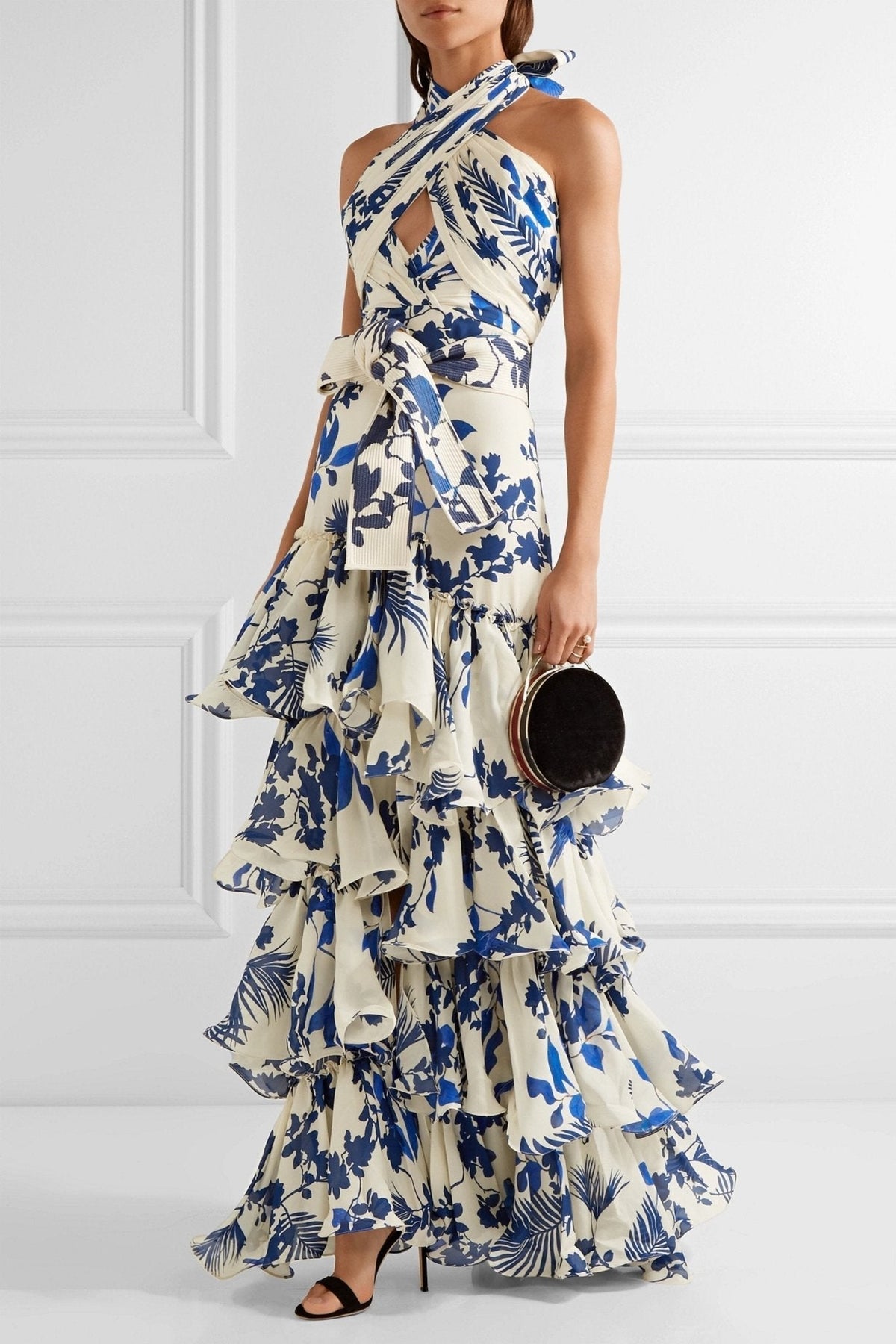 Kinna - bedrukte halternek maxi-jurk met ruches