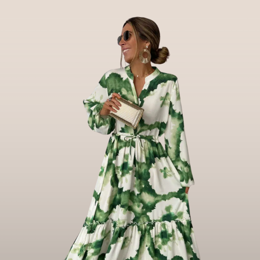 Lange damesjurk met print – Losvallend model met taillekoord en V-hals