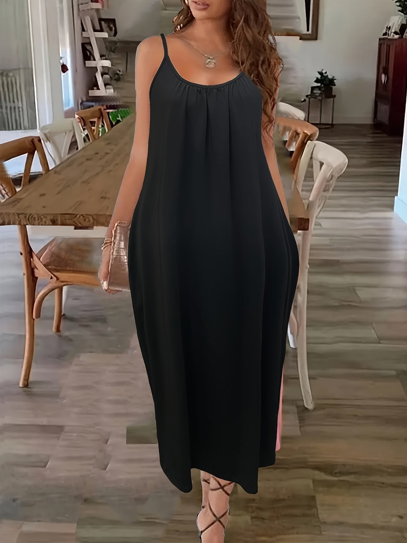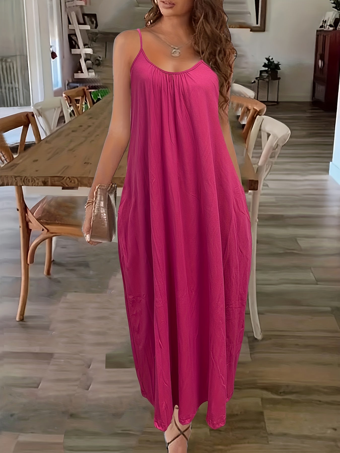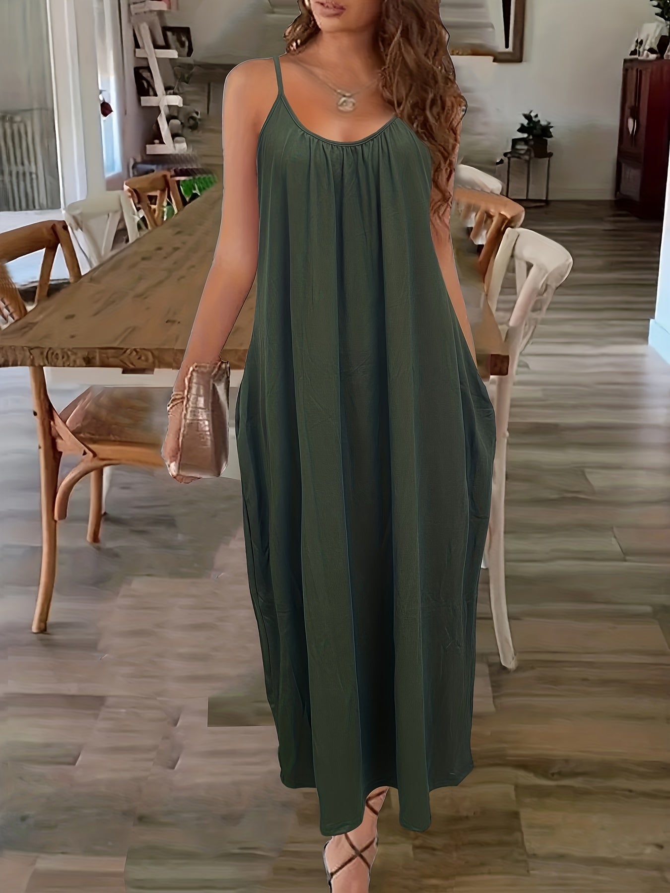 Deze elegante maxijurk met spaghettibandjes en handige zijzakken biedt zowel comfort als flair. De losse pasvorm zorgt voor een moeiteloze uitstraling die ideaal is voor zowel een casual dagje uit als een avondje met vrienden. Bestel jouw favoriete stijl vandaag nog bij Mowa-Mode!