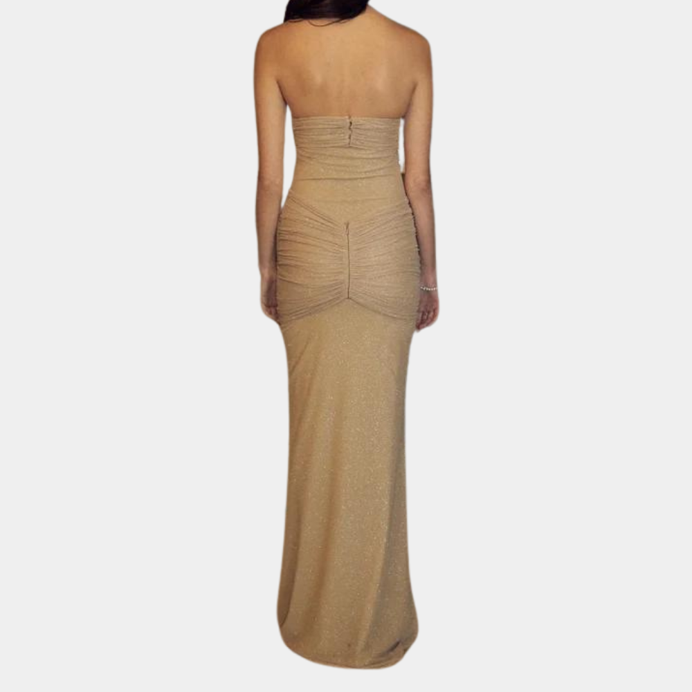 Elk aspect van deze jurk is zorgvuldig ontworpen om een verleidelijk en toch verfijnd silhouet te creëren. Van het strapless ontwerp dat de nek- en schouderlijn accentueert tot de zachte stof die sierlijk om je rondingen valt, deze jurk is een meesterwerk van mode.
