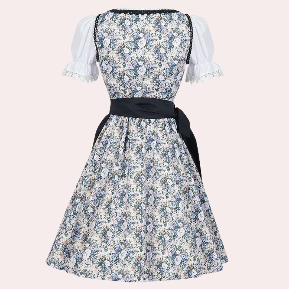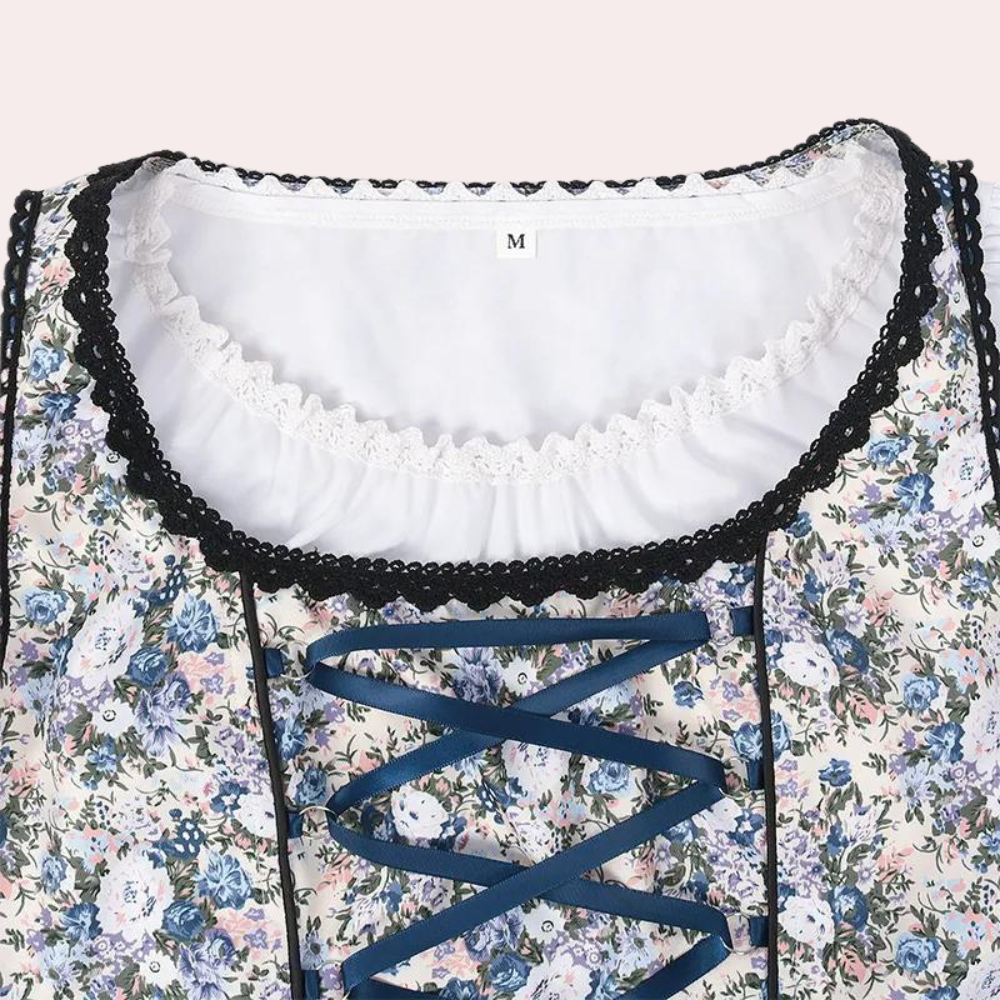 De geplooide rok voegt een vleugje elegantie toe, terwijl de opgeblazen mouwen en delicate afwerking de authenticiteit van de jurk versterken, waardoor hij ideaal is voor feestelijke gelegenheden zoals Oktoberfest, themafeesten of culturele evenementen.