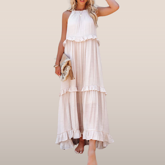 Lange luchtige jurk met een mouwloos haltermodel en gelaagde rok, afgewerkt met fijne ruches voor een vloeiende uitstraling en een ontspannen pasvorm.