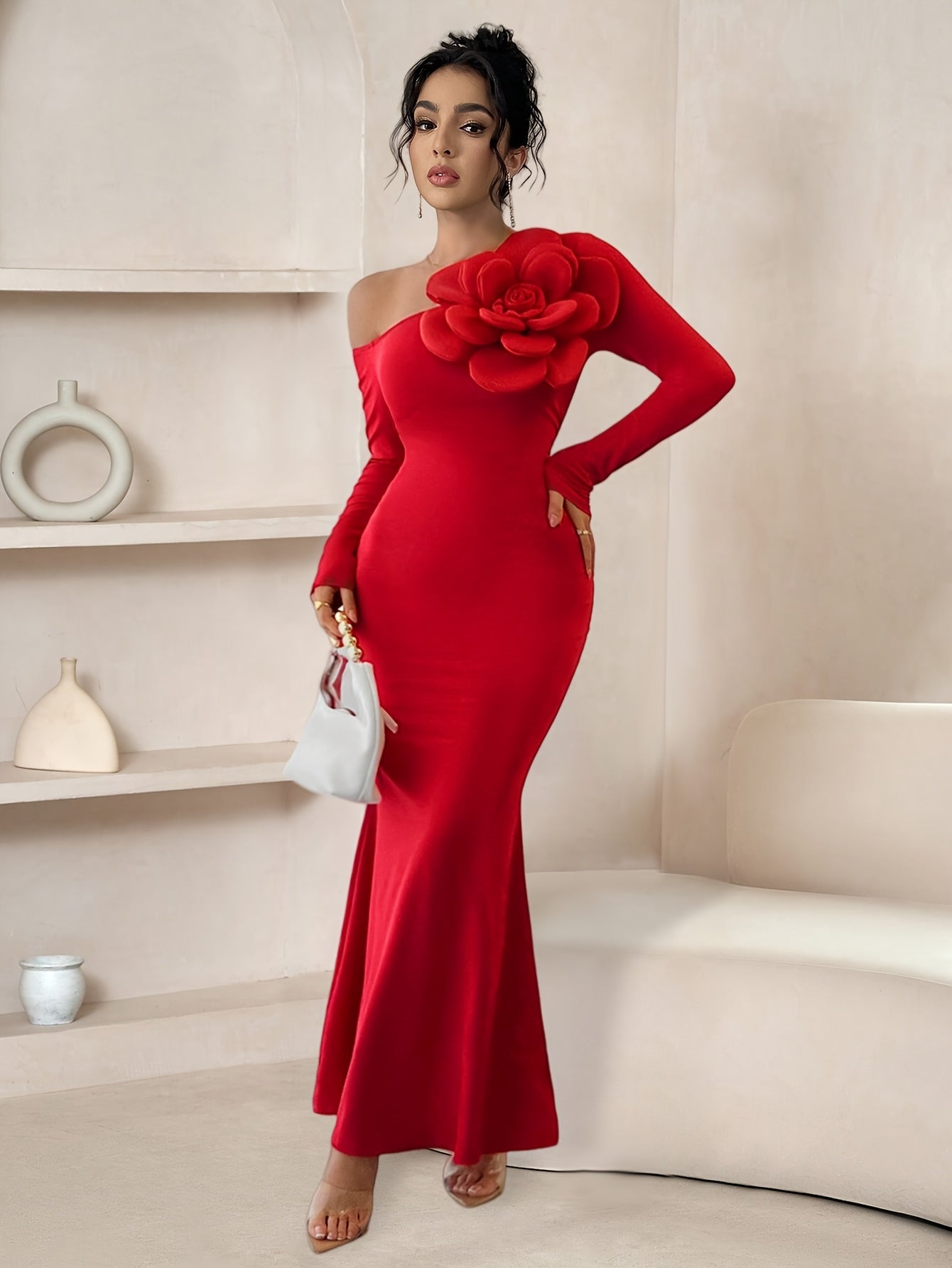 Deze prachtige jurk met een asymmetrische halslijn en een opvallend bloemdetail straalt luxe en vrouwelijkheid uit. Het aansluitende silhouet benadrukt je vormen op een elegante manier, terwijl de lange mouwen en vloeiende pasvorm zorgen voor een stijlvolle uitstraling. Ideaal voor chique avondgelegenheden of speciale evenementen. Bestel jouw favoriet vandaag nog bij Mowa-Mode!
