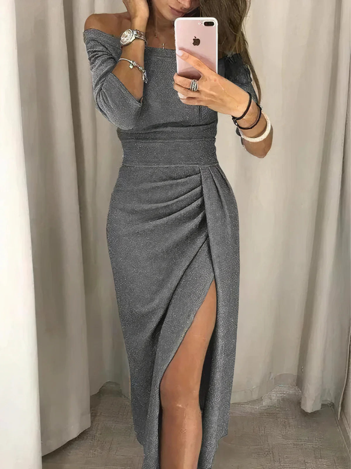 De Nora – Elegante Split Jurk voor Dames straalt verfijning en stijl uit. Gemaakt van een luxe polyesterblend, heeft deze jurk een flatterende pasvorm met een elegante split die een vleugje glamour toevoegt. Perfect voor feestjes, diners of formele gelegenheden.