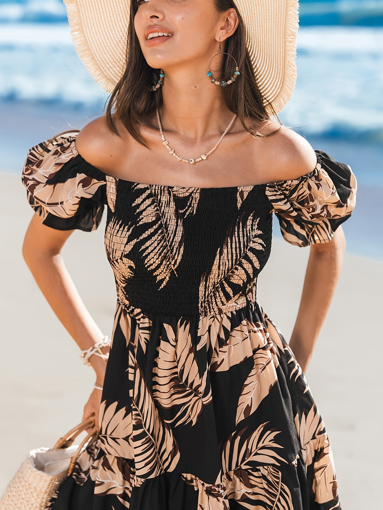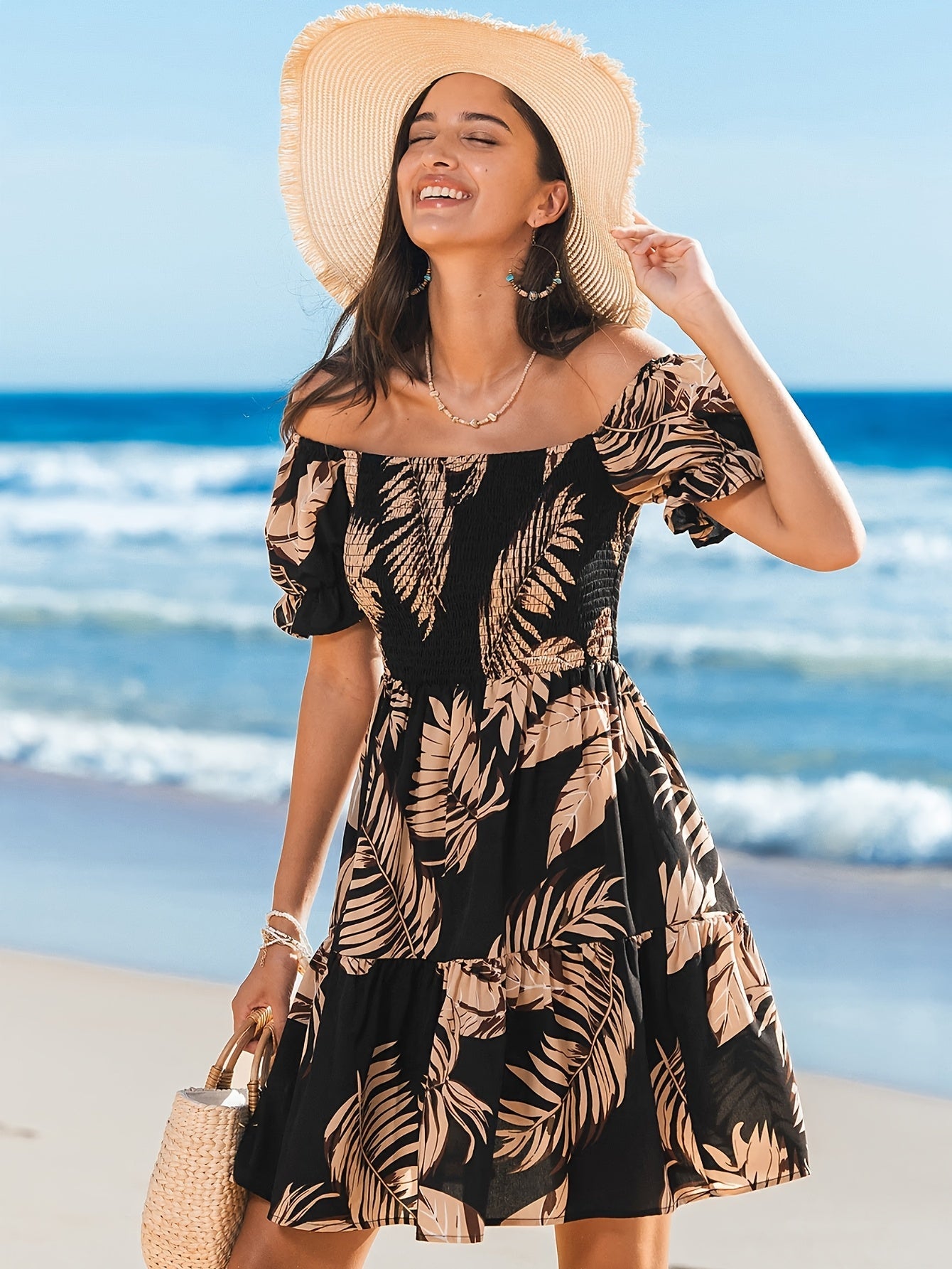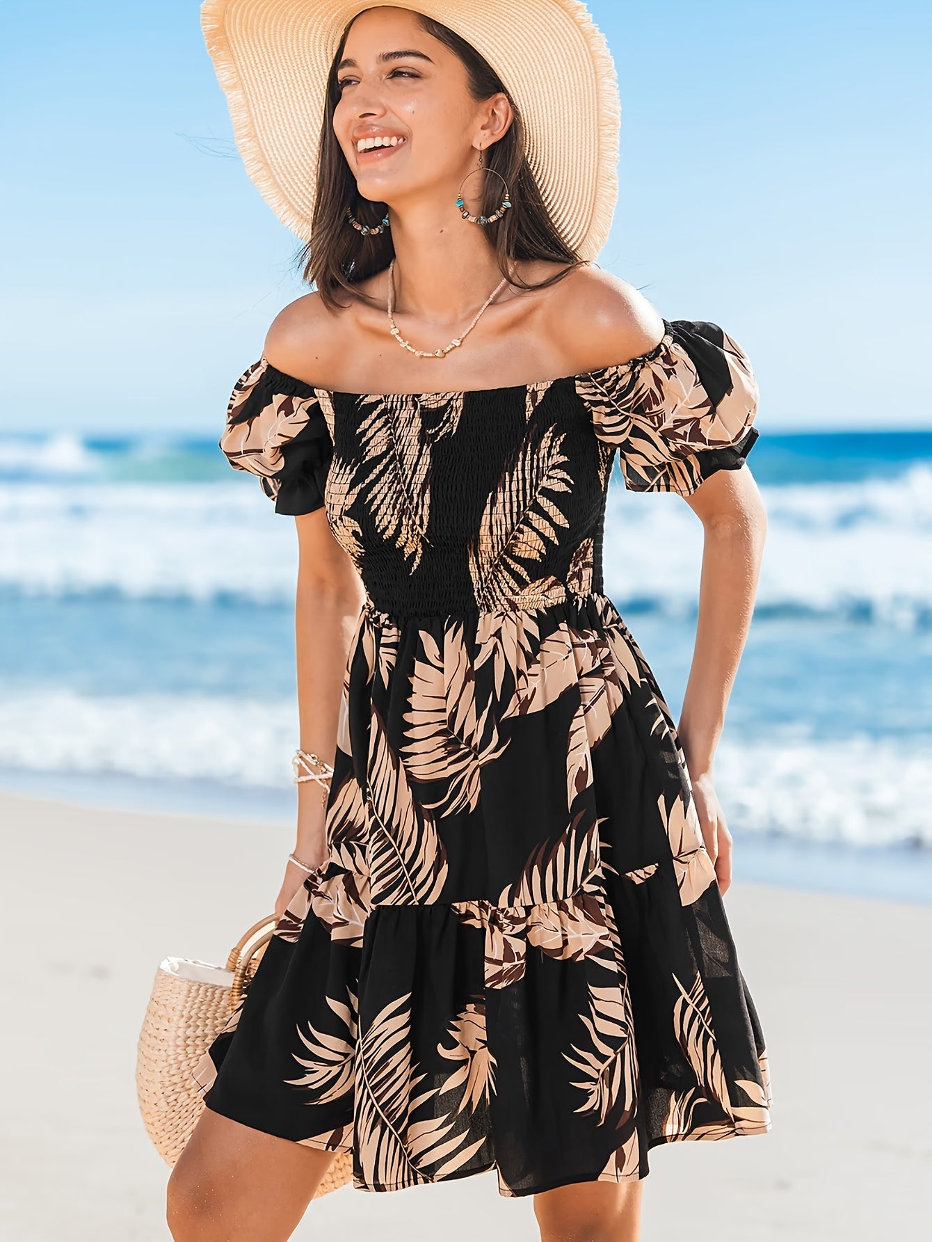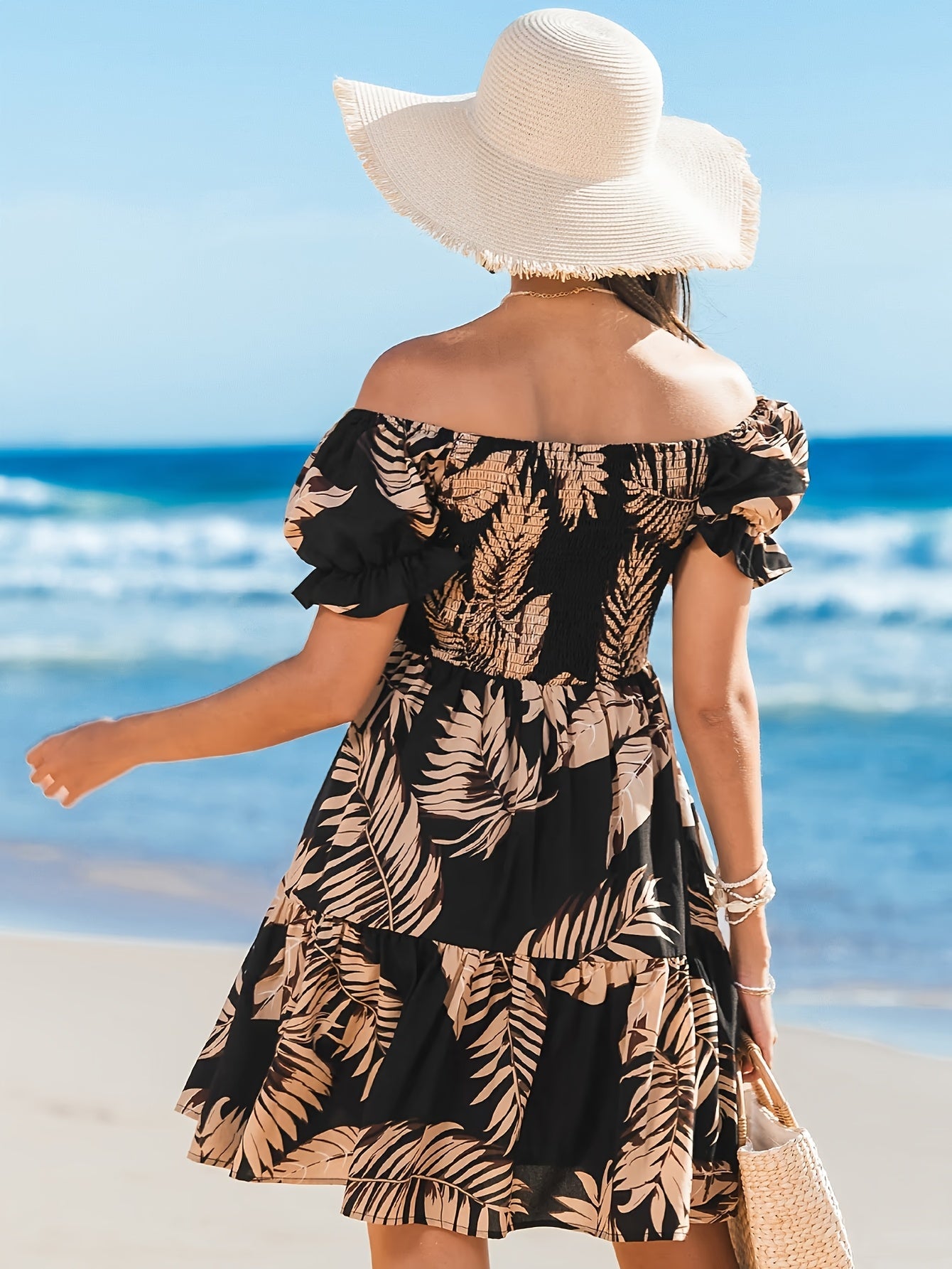 Deze charmante off-shoulder jurk met een tropisch bladerenpatroon is de ideale keuze voor een zomerse look. De elastische schouderbanden en luchtige gelaagde snit zorgen voor een comfortabele, maar toch modieuze uitstraling. Of je nu geniet van een dag op het strand of een informele avond uit, deze jurk maakt je look compleet. Bestel jouw favoriete model vandaag nog bij Mowa-Mode!