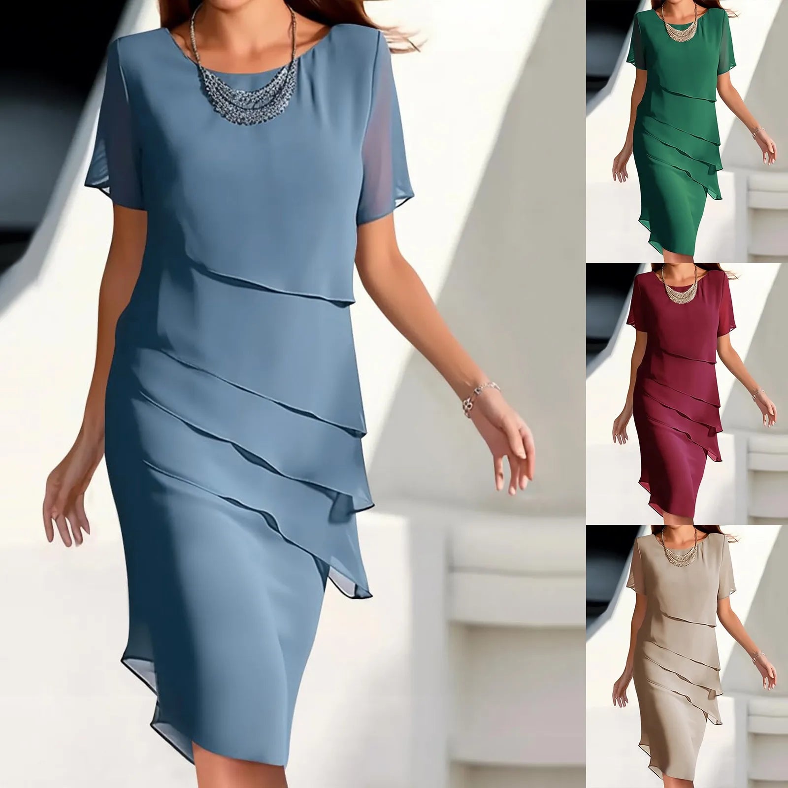 Deze prachtige afslankjurk is vervaardigd uit luchtige chiffon en heeft een elegant gelaagd ontwerp waardoor je er slanker uit ziet . De jurk valt prachtig en biedt een comfortabele pasvorm, waardoor je je zelfverzekerd en stijlvol voelt, of je nu naar een feestje, casual uitje of een speciale gelegenheid gaat.