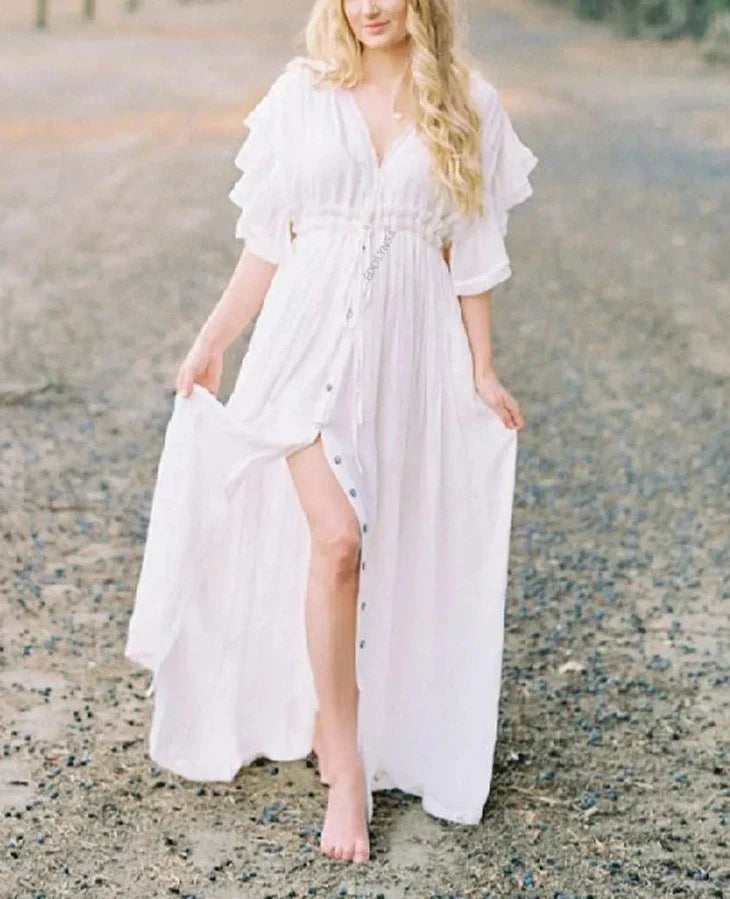 Met de Ruby maxi jurk met ruches ben je klaar voor elke gelegenheid, of het nu een zomerse bruiloft is, een romantisch diner of gewoon een dagje uit met vrienden. Deze jurk combineert comfort met stijl en laat je stralen waar je ook gaat.