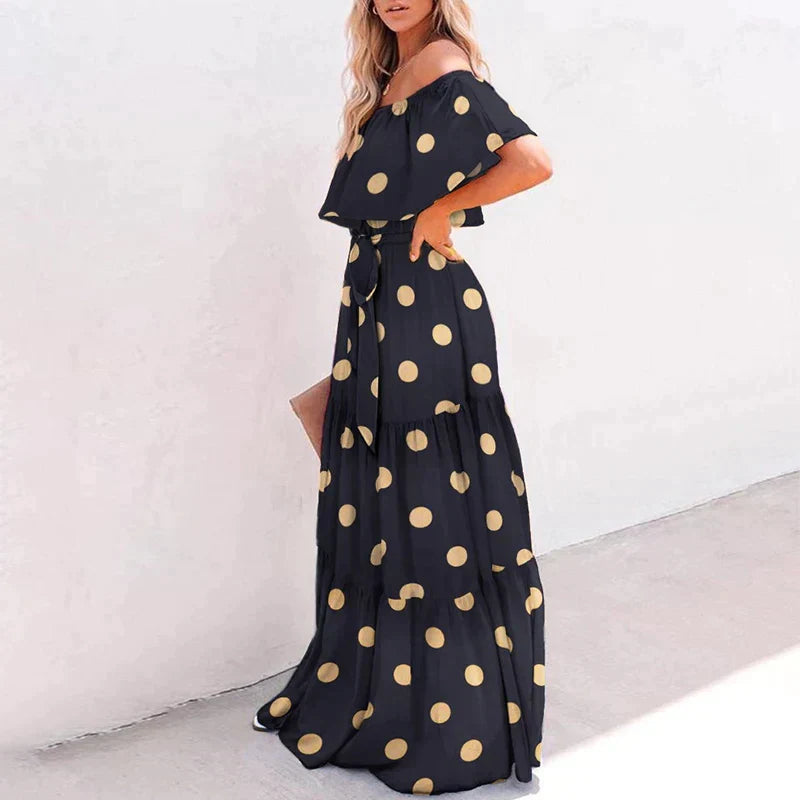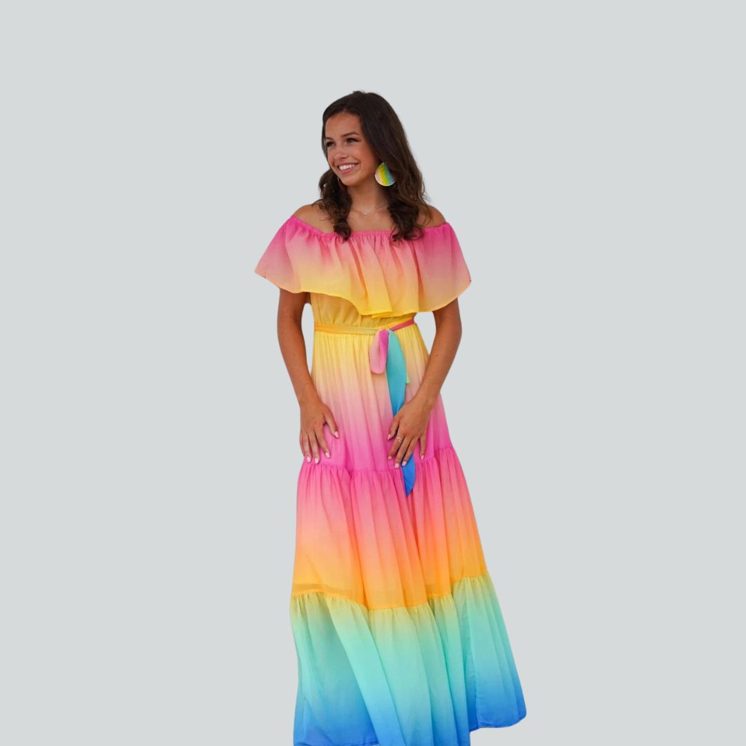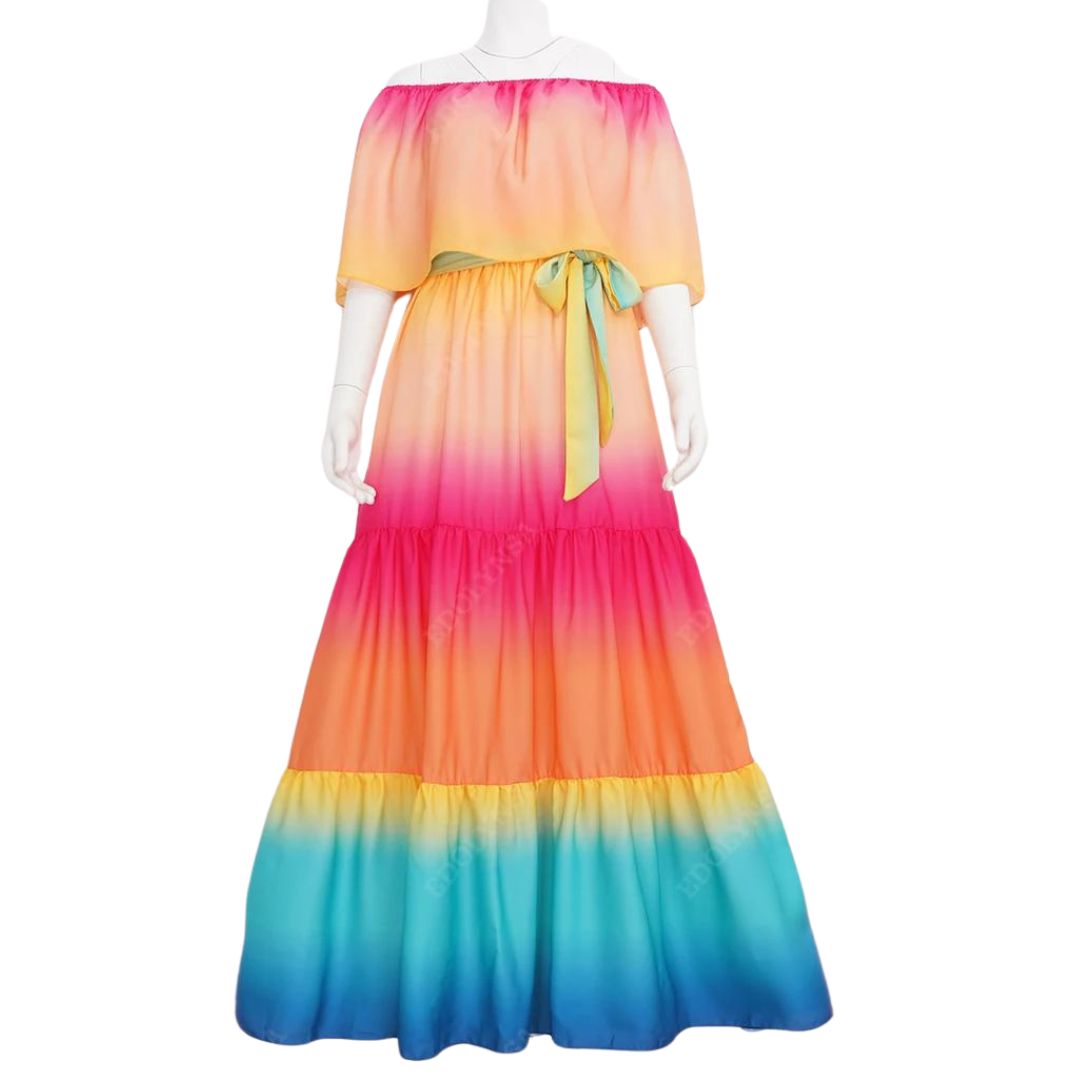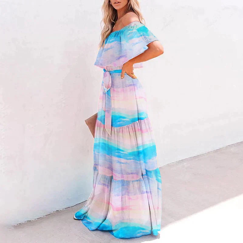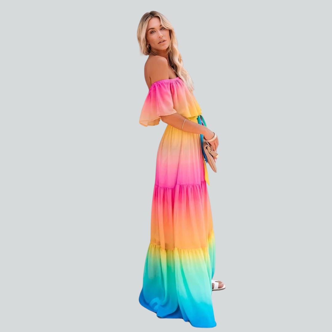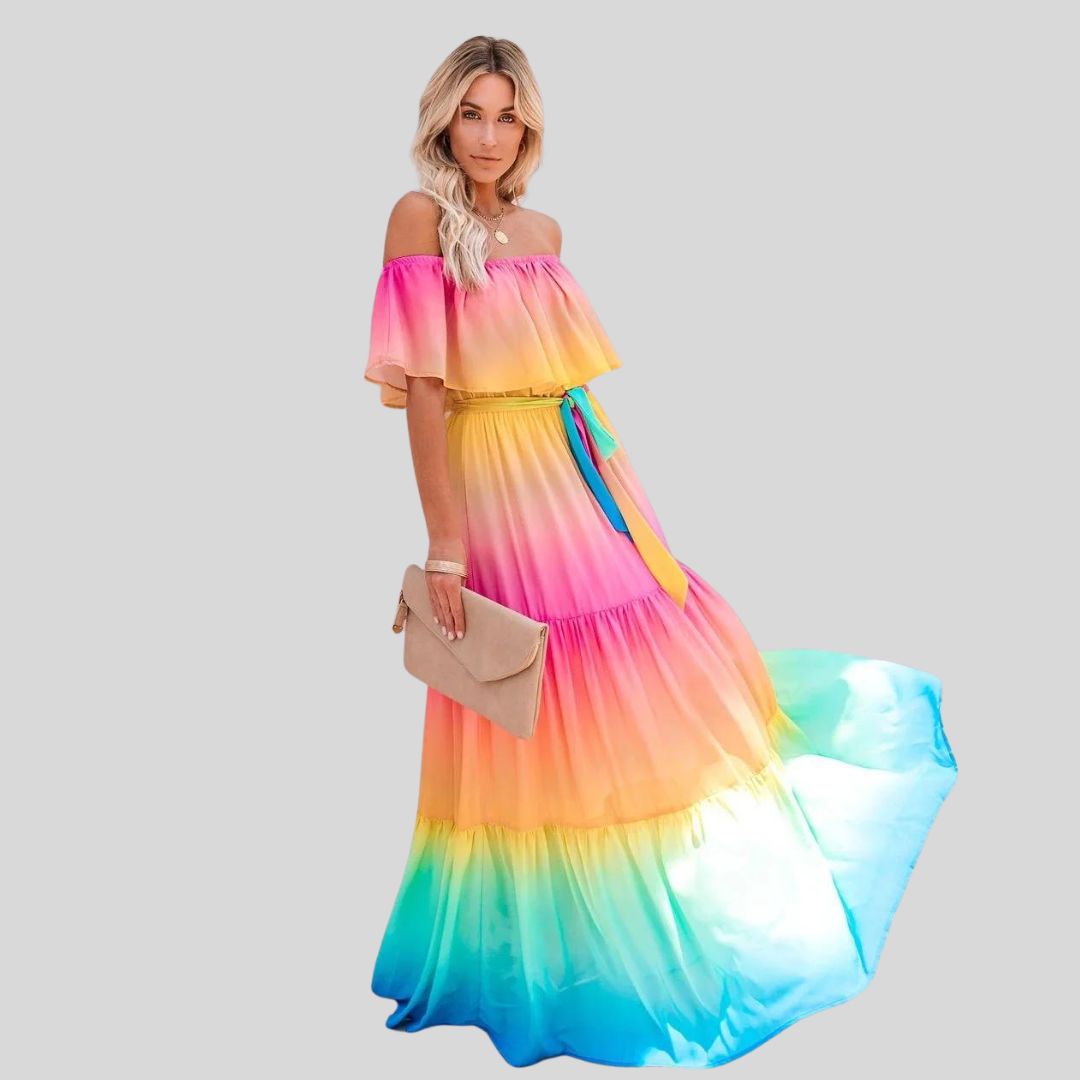 Vang de essentie van de zomer met deze Stellara - Lange jurk met ruches. De off-the-shoulder ruches en benadrukte taille creëren een flatterend silhouet, terwijl de vloeiende lagen een speelse en opvallende beweging bieden. Perfect voor een stranddag of een feestelijk buitenevenement, deze jurk is een feest van kleur en vreugde.