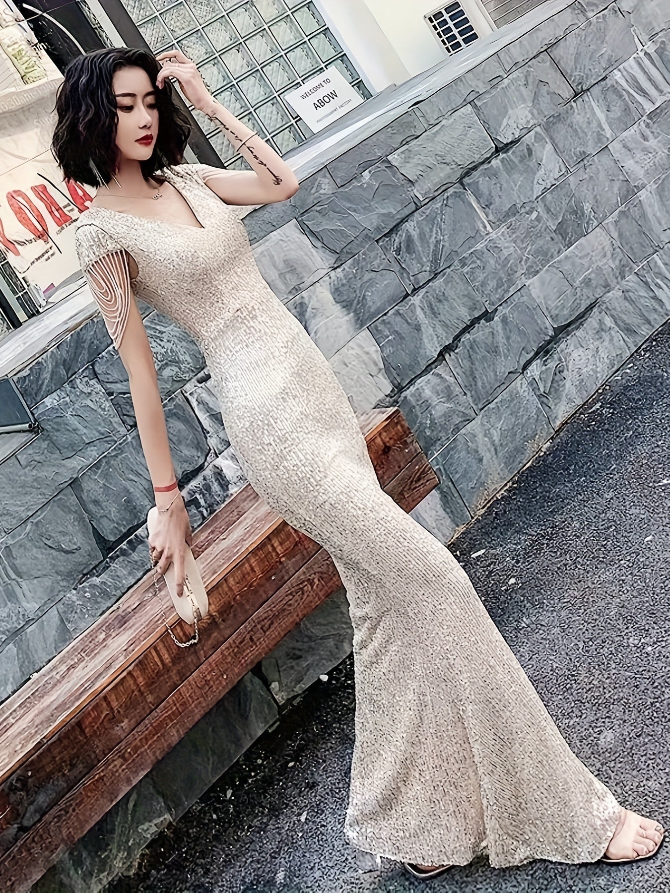 Deze betoverende lange avondjurk met sequins en een elegante V-hals is het perfecte statement voor feesten, bruiloften of speciale gelegenheden. De nauwsluitende pasvorm benadrukt je figuur, terwijl de glinsterende sequins je laten schitteren in het licht. De stijlvolle raglanmouwen en de dramatische mermaid snit zorgen voor een verfijnde en tijdloze look. Bestel jouw favoriete model vandaag nog bij Mowa-Mode!