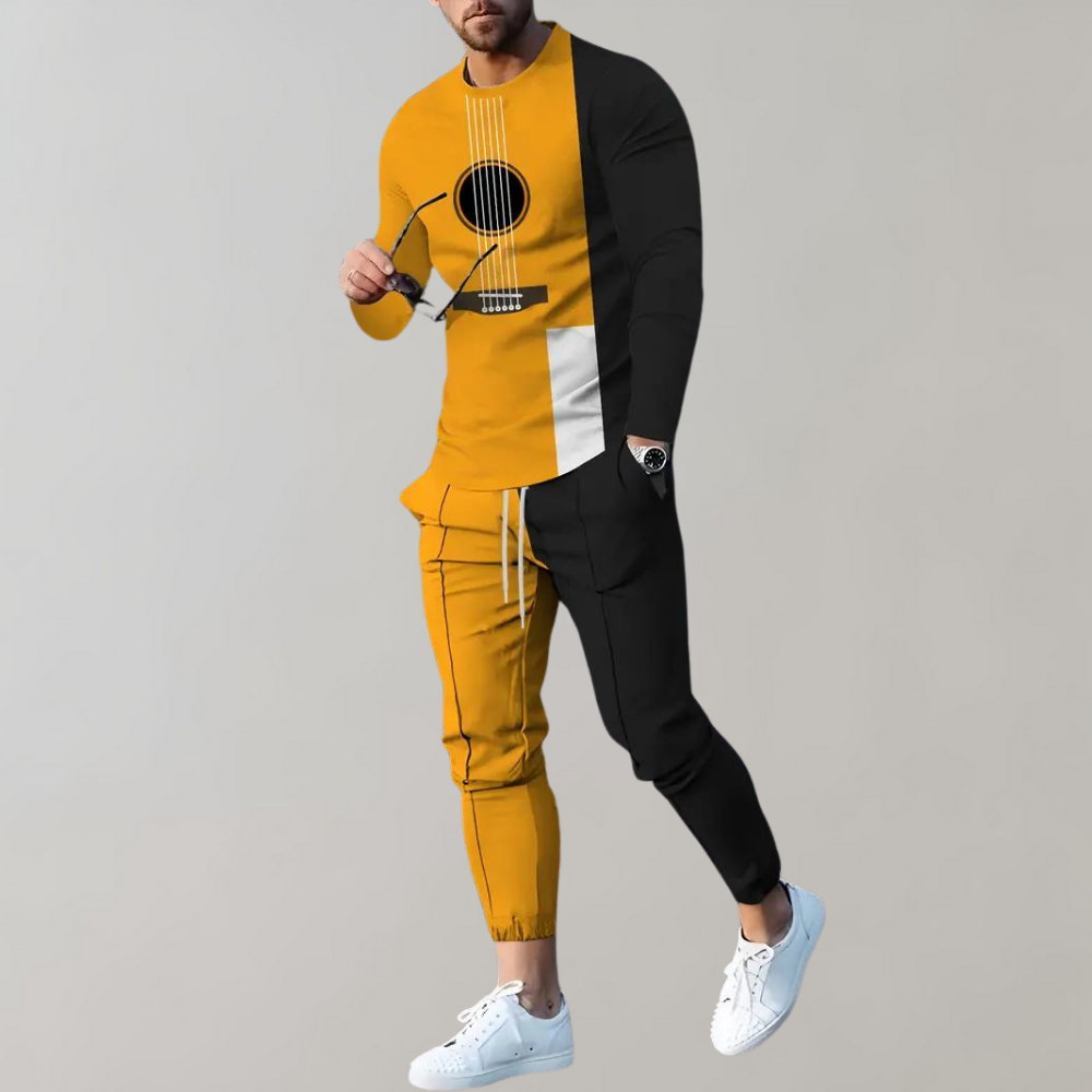 Hier heb je onze Birger Trainingspak voor heren met gitaarprint. Deze 2-delige set is zowel comfortabel als stijlvol voor het uitgaan, maar ook voor thuis op de bank. Deze 2-delige set is gemaakt van een comfortabele stof die geschikt is voor de lente, herfst en winter.