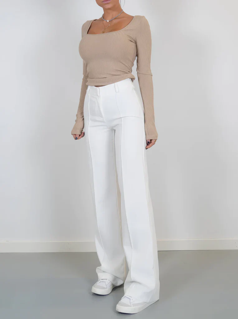 Trendy high waisted broek met flared pijpen en naaddetails, ideaal voor een vrouwelijke en moderne look die zowel casual als gekleed gedragen kan worden.