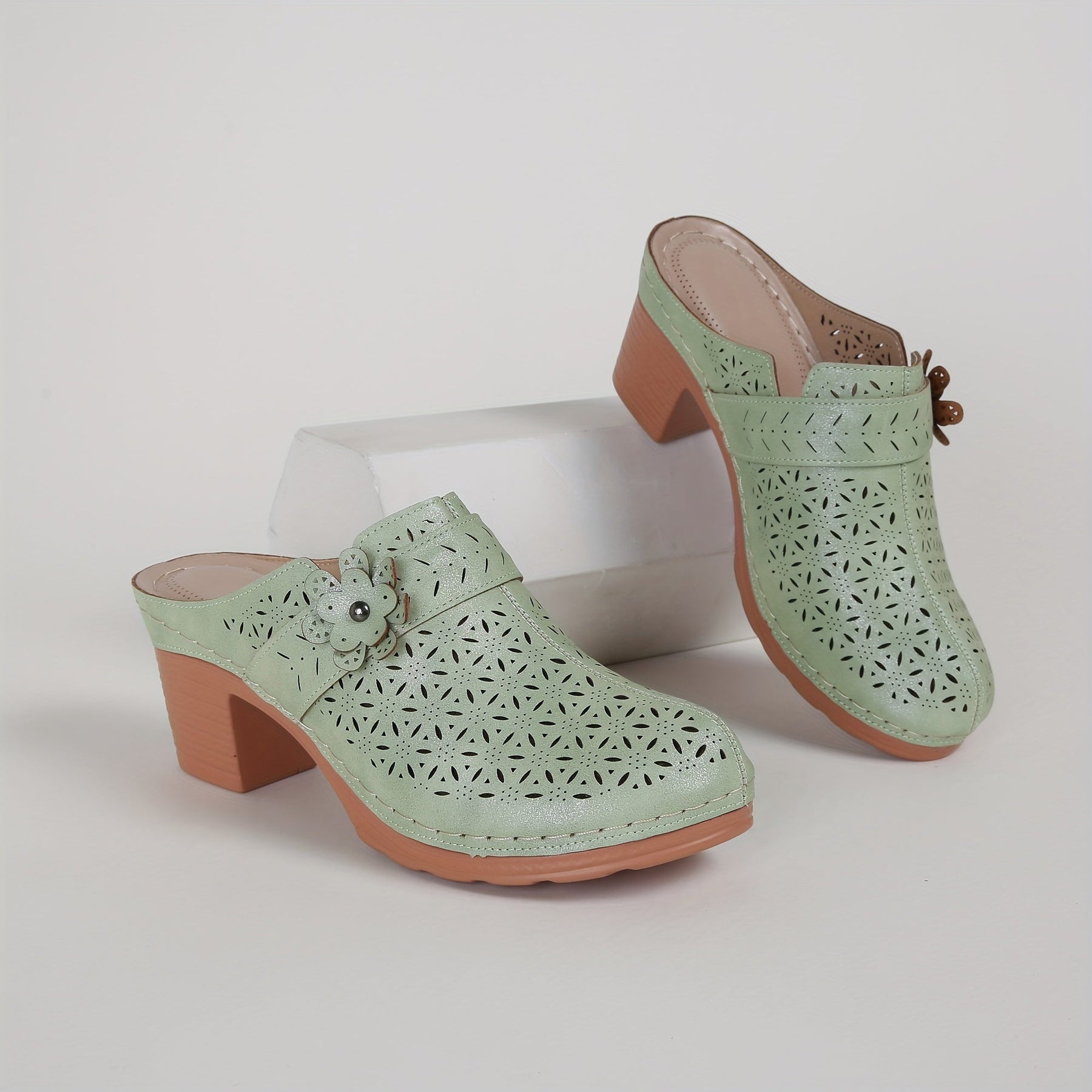 Flora | Women's mules with a thick heel and perforated floral decoration