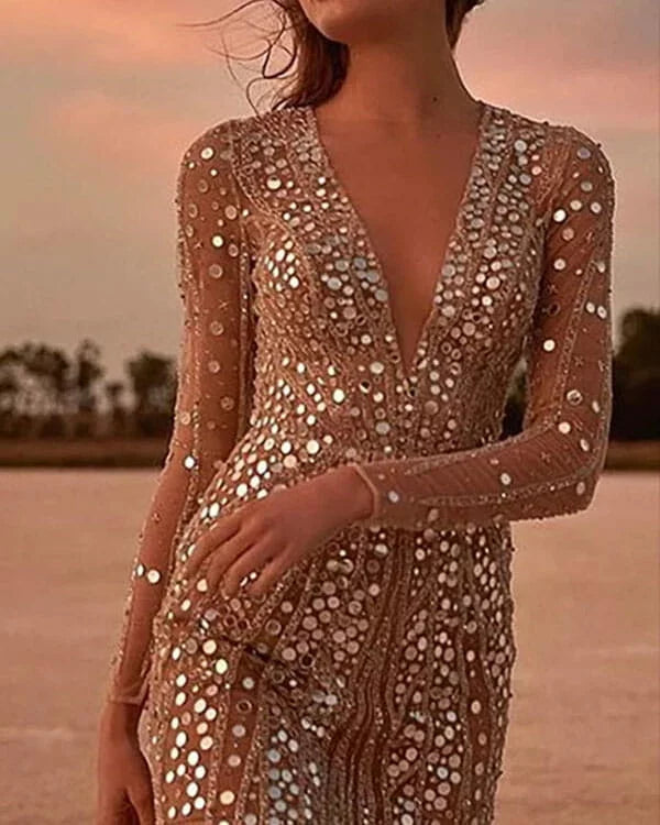 Want to shine at every party? The Valencia dress is covered in sparkling sequins and features an elegant V-neck with sheer sleeves for a chic yet bold look. Perfect for luxury events and special evenings.