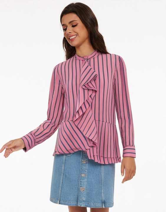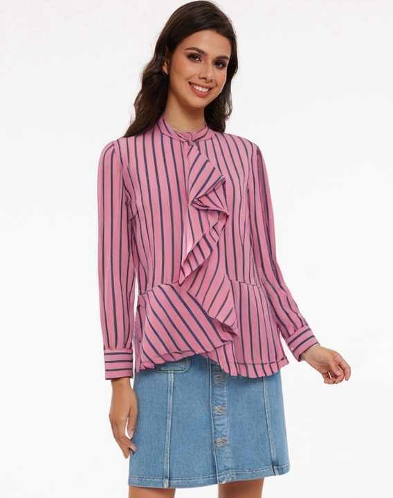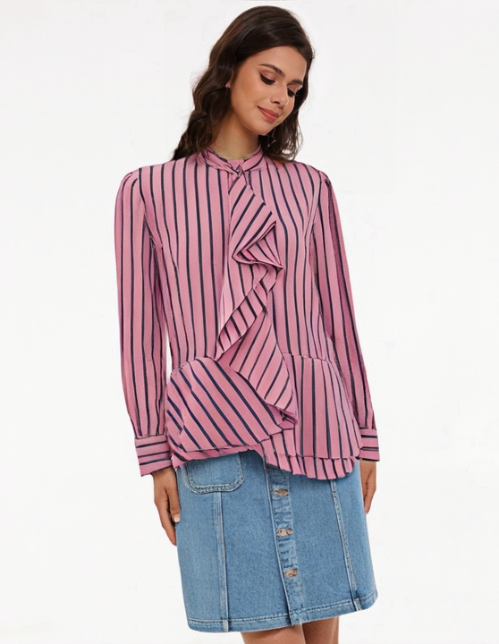 Geef je garderobe een speelse twist met deze stijlvolle gestreepte blouse. Het unieke ruchesontwerp voegt een vleugje elegantie toe, perfect voor zowel casual als formele gelegenheden. De flatterende snit en tijdloze strepen maken het een veelzijdige keuze voor elke vrouw die comfort en stijl combineert.