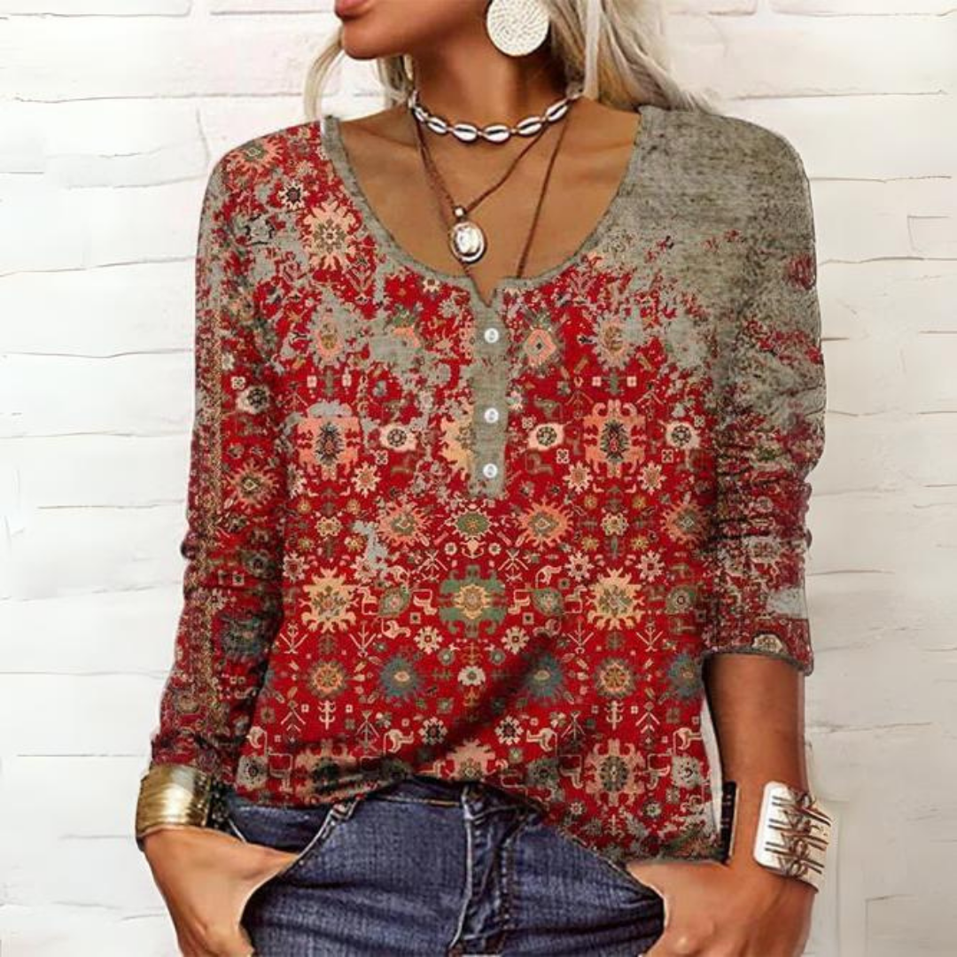 Maak kennis met de Carmen - Casual Gedrukt Top voor Vrouwen, een stijlvolle toevoeging aan je garderobe die retro charme en moderne flair perfect combineert. Het opvallende Azteekse patroon maakt deze top tot een unieke keuze, ideaal voor elke gelegenheid, of je nu casual of iets formeler gekleed gaat.