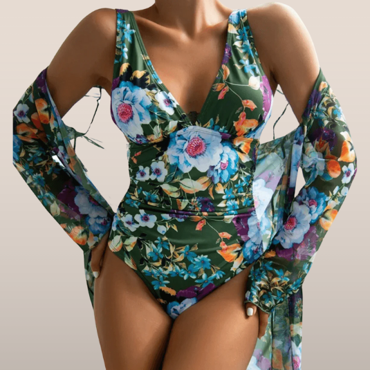 Dit elegante badpak met een diepe V-hals en kleurrijke bloemenprint biedt een flatterend silhouet voor strand- en zwemmomenten. De gedetailleerde print en strategische plooien zorgen voor een stijlvolle en vrouwelijke uitstraling.