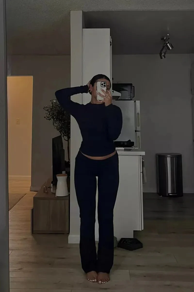 Dames lounge set – Ribstof met stretch en aangesloten pasvorm