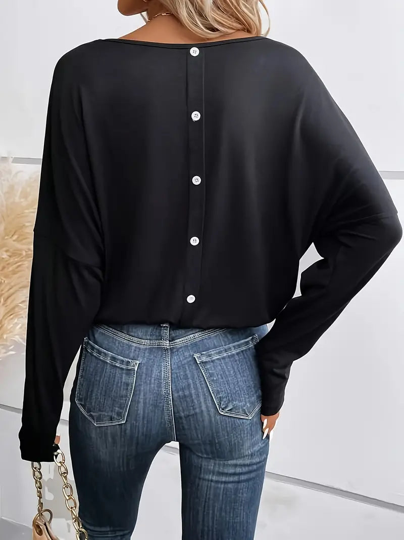 Creëer een verfijnde look met onze Evi trui, voorzien van een V-hals en elegante knoopdetails op de rug.