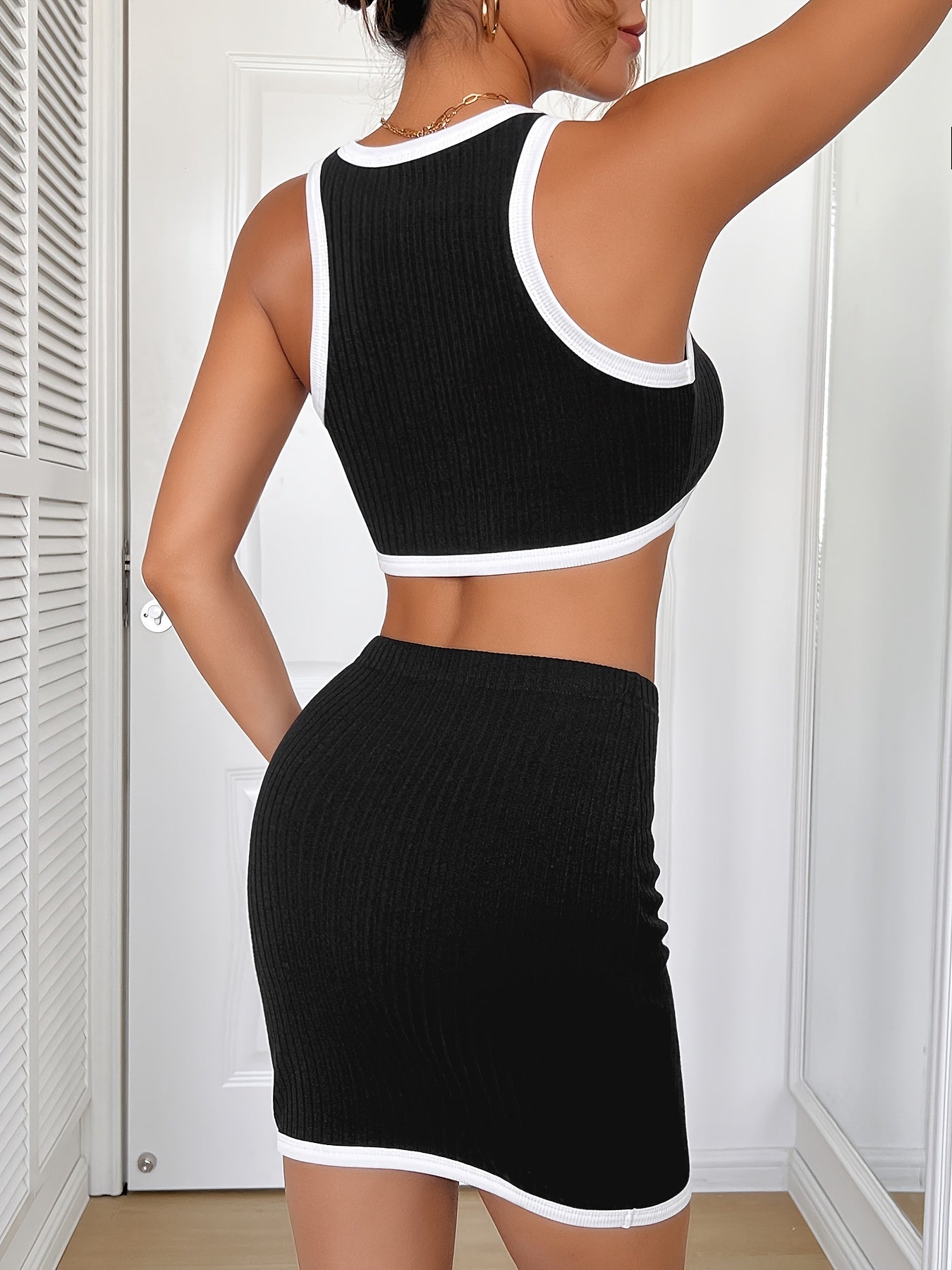 Laat je stijl spreken in deze gedurfde en trendy ribbed set met een elegante cut-out en contrasterende afwerking!
