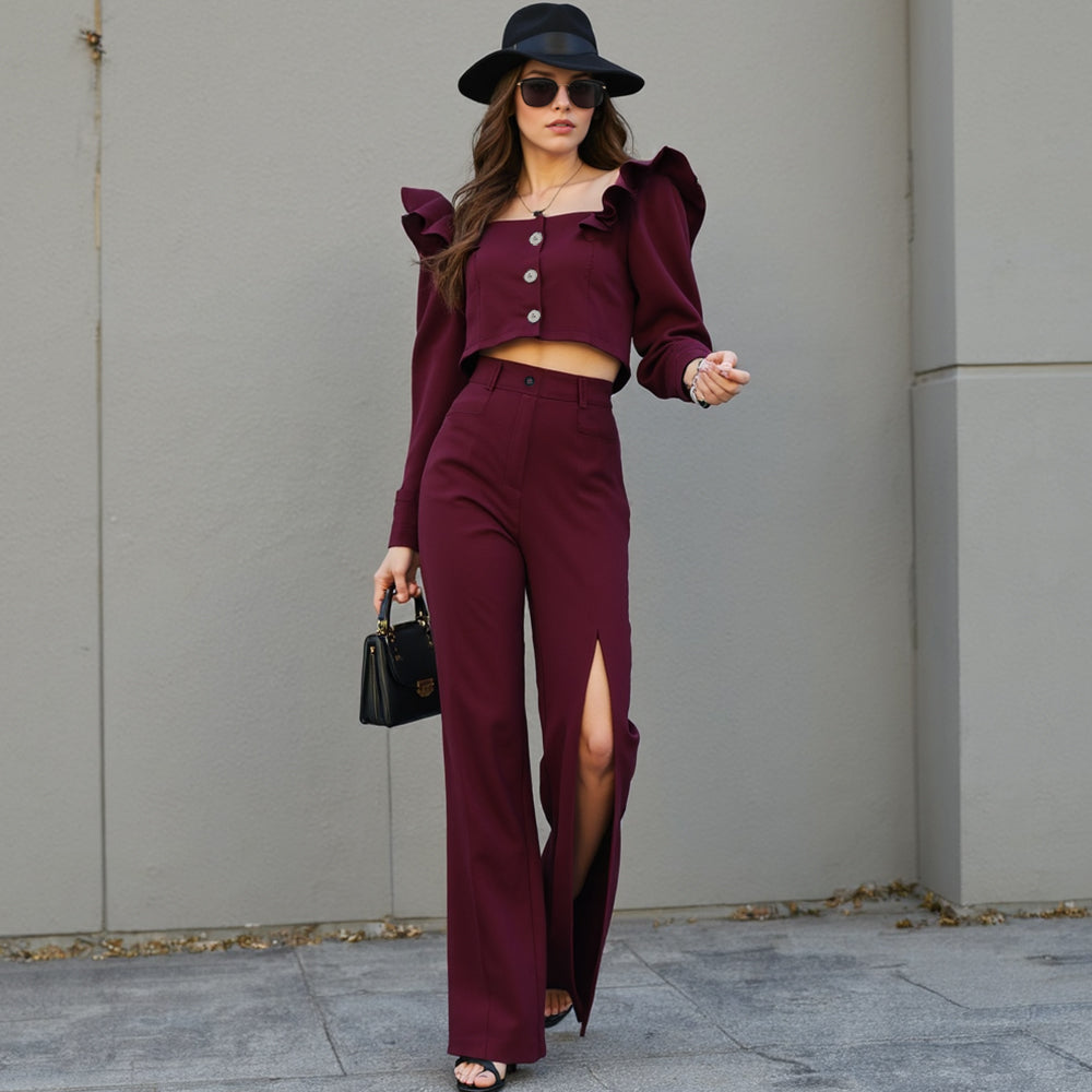 Nathalie | Chic Tweedelig Broekpak met Ruches