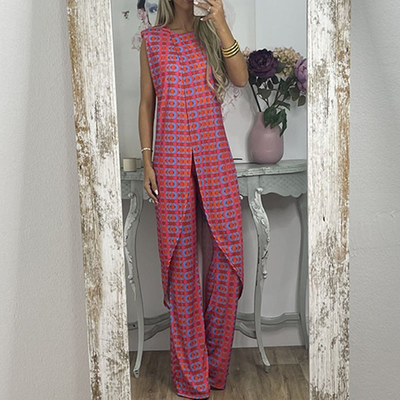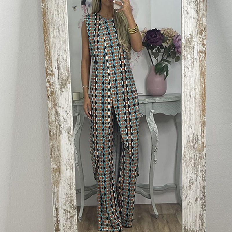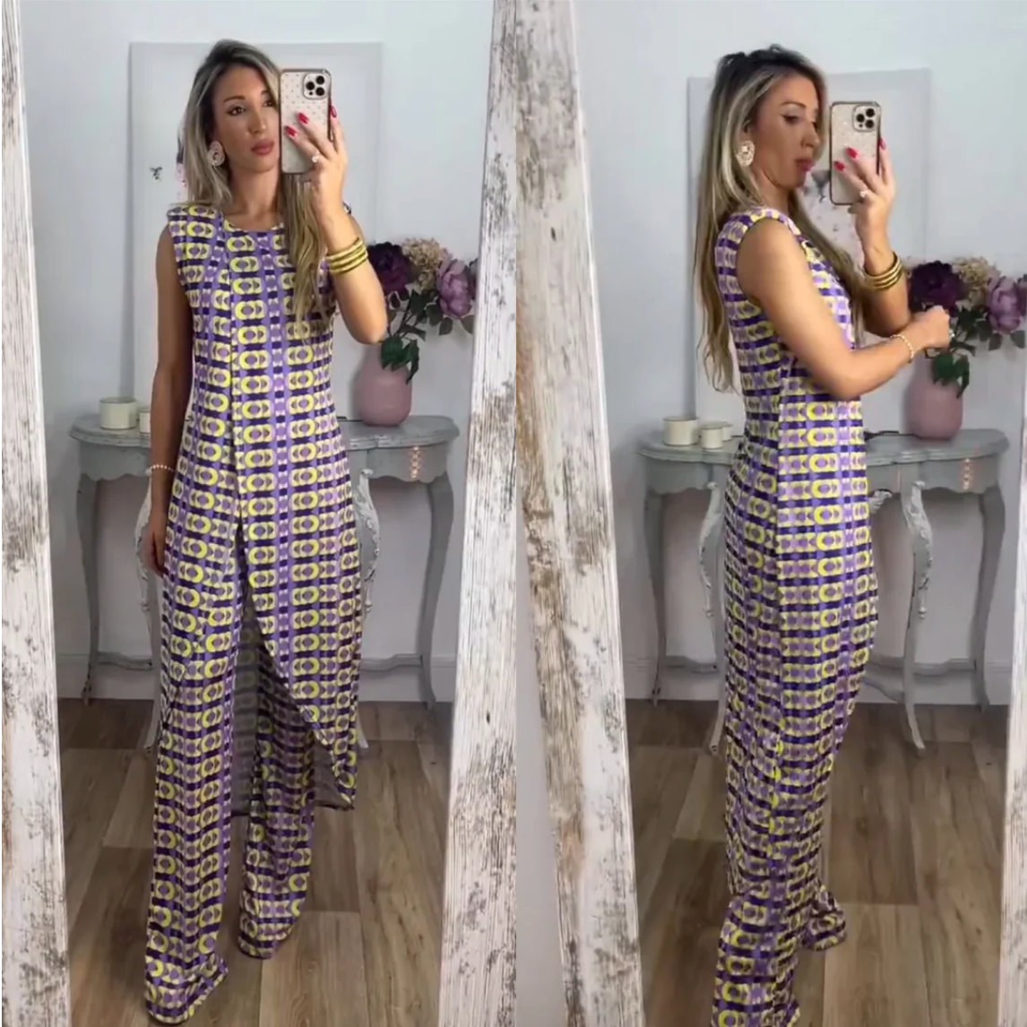 Maak kennis met de Neith - Comfy Set met Abstracte Print, ontworpen voor de vrouw die zowel comfort als stijl belangrijk vindt. Deze veelzijdige set combineert een mouwloos topje met wijde pijpen, en biedt een stijlvolle maar praktische oplossing voor die koele zomerdagen. De Neith-set valt op door zijn levendige patroon, waardoor je er moeiteloos verzorgd uitziet, of je nu van een ontspannen dagje uit geniet of een speciale gelegenheid bijwoont.