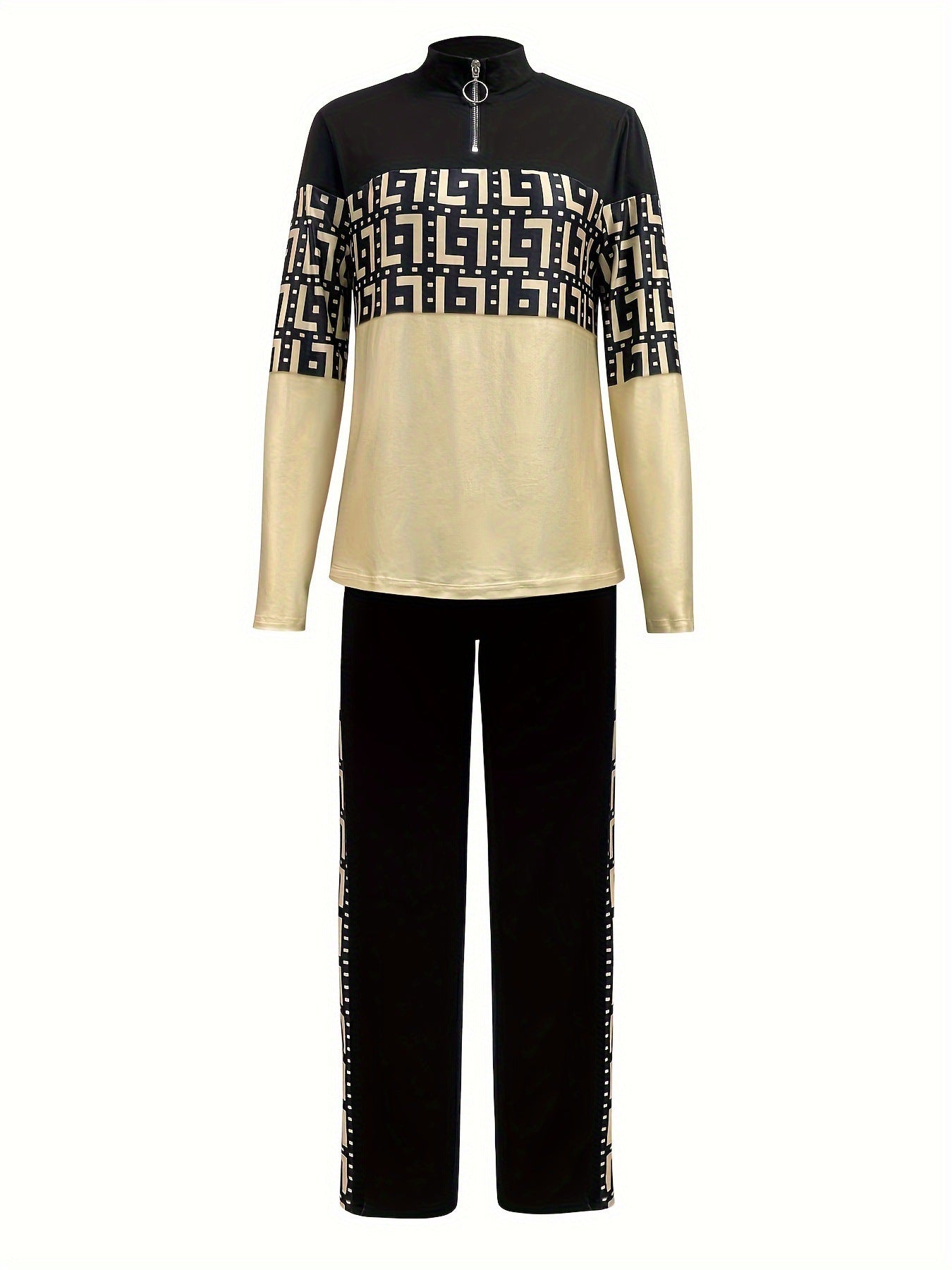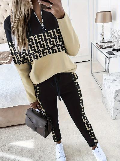 Maak kennis met de Nero - Elegant Patroon Set voor Vrouwen, een ideale combinatie van luxe en comfort. Deze stijlvolle set, bestaande uit een oversized sweatshirt en bijpassende sweatpants, is ontworpen voor vrouwen die comfort waarderen zonder in te boeten op elegantie. Het geometrische patroon in zwart en goud geeft een verfijnde uitstraling, perfect voor zowel ontspannen momenten thuis als casual uitjes.