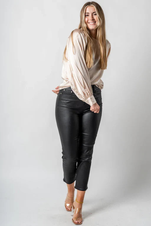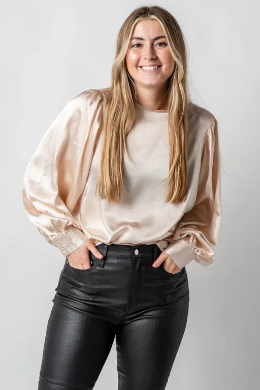 Elegante satijnen champagne blouse met stijlvolle ballonmouwen. Deze blouse heeft een luxe uitstraling dankzij de glanzende stof en biedt een comfortabele, luchtige pasvorm. Ideaal om elke outfit een chique en verfijnde touch te geven, perfect voor zowel formele als casual gelegenheden.