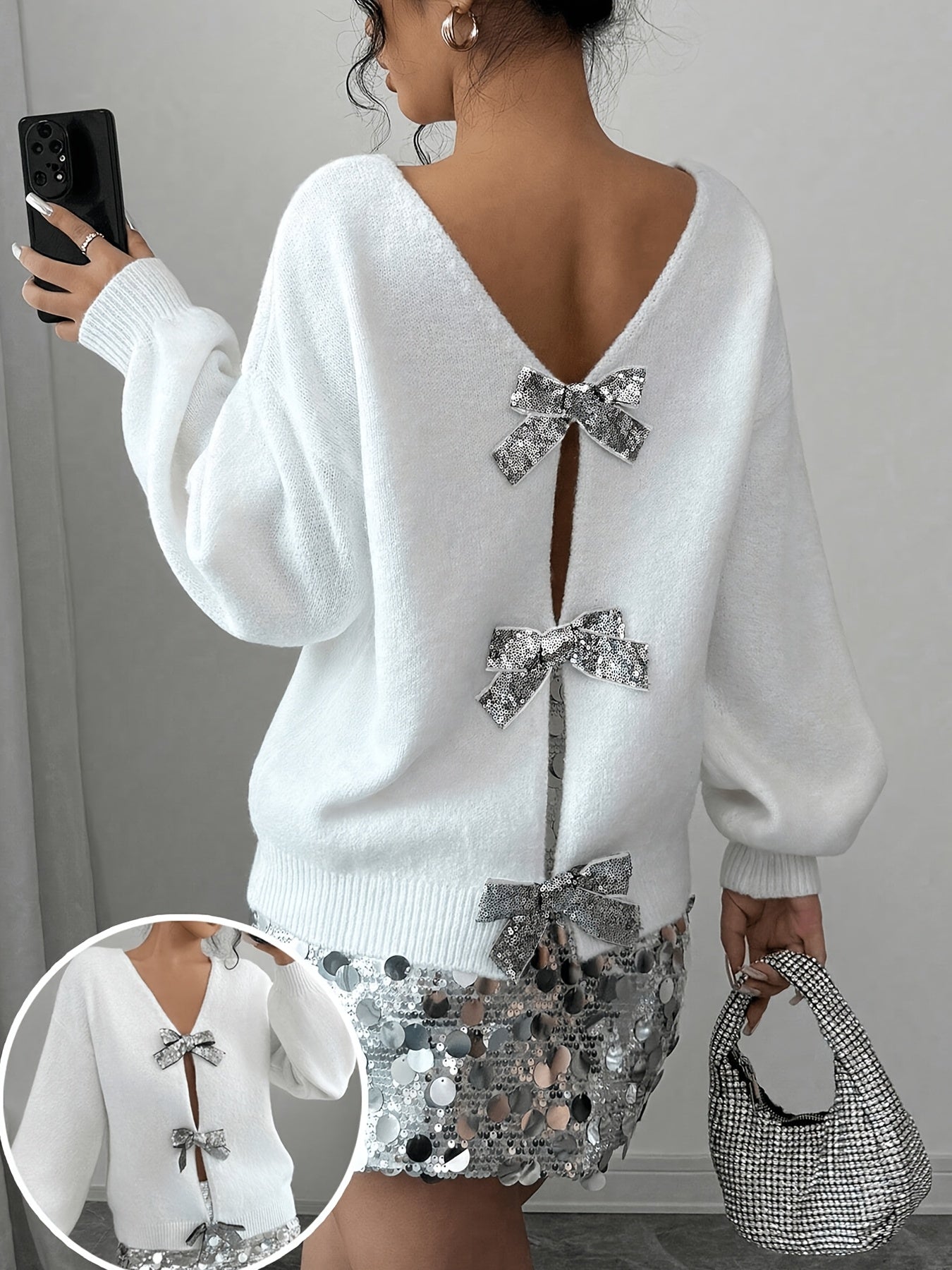 Quincy | Elegante V-hals Trui met Pailletten Strikjes