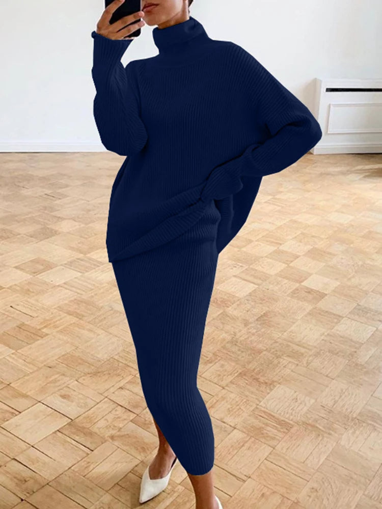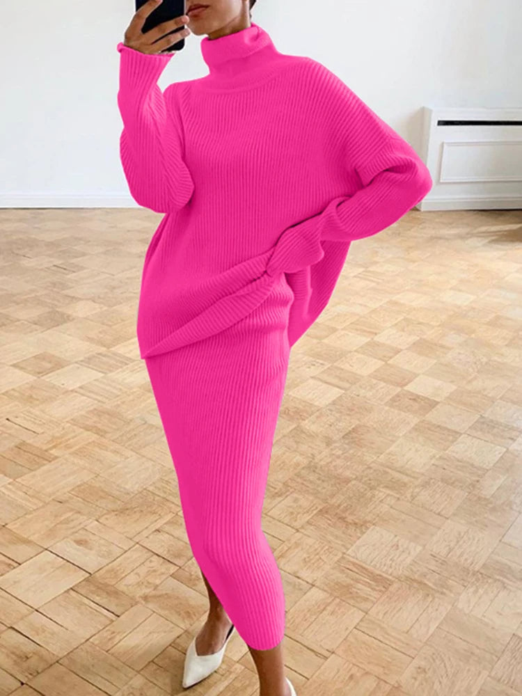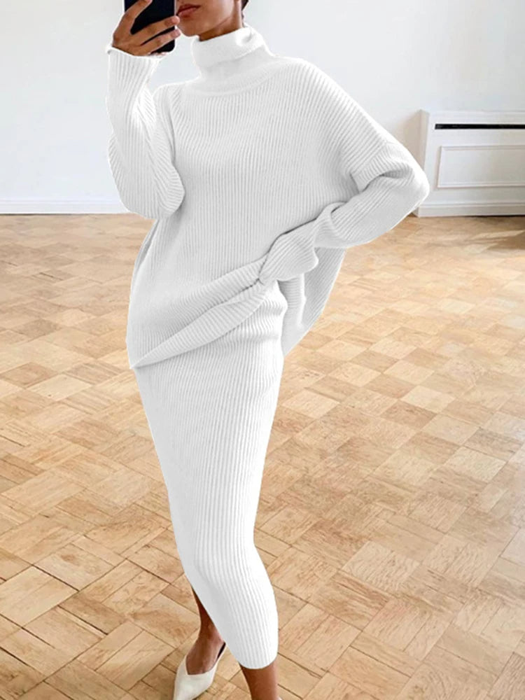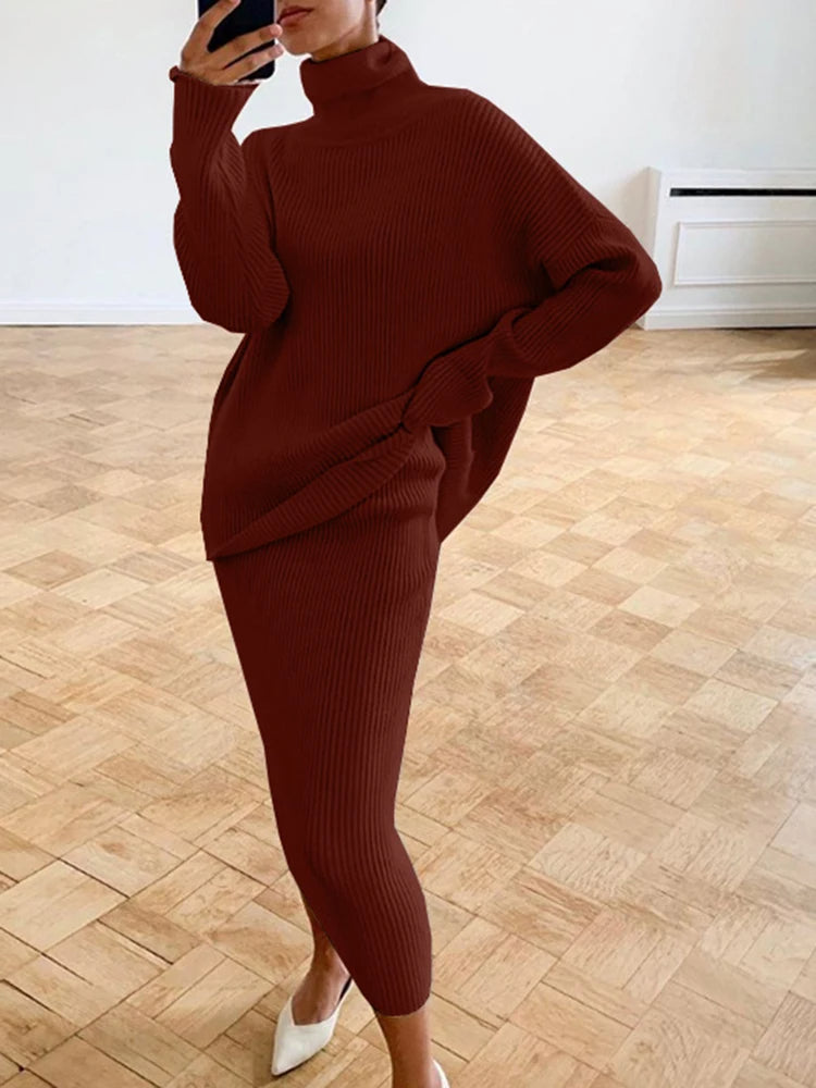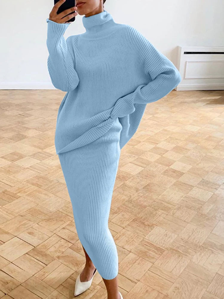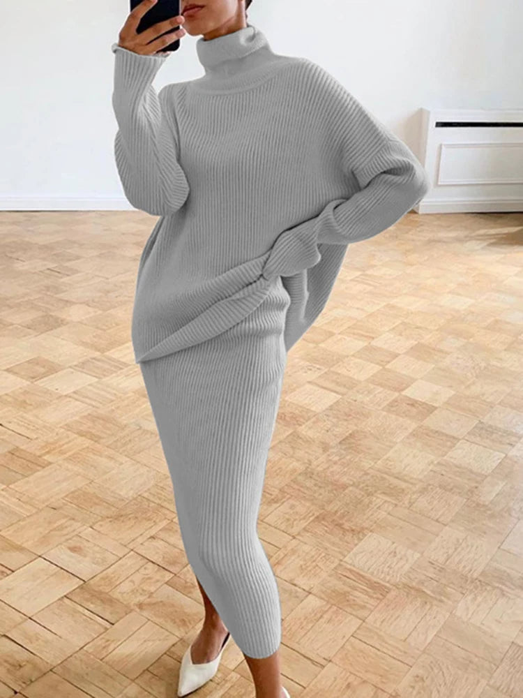 Transformeer je garderobe met onze verfijnde twee-piece outfit, ontworpen voor elke gelegenheid. Deze ensemble heeft een elegante zilveren tint die hedendaagse flair uitstraalt. Het omvat een gezellige coltrui met lange mouwen, perfect gecombineerd met een bijpassende rok—ideaal voor zowel formele als casual settings.