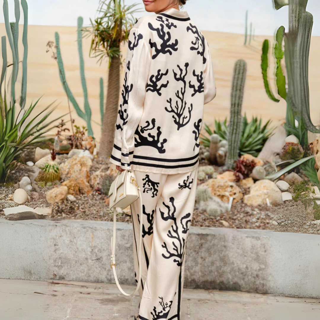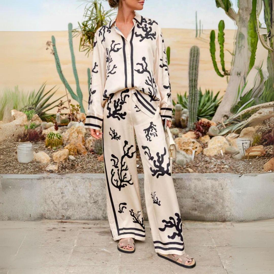 Deze stijlvolle tweedelige set voor dames biedt een perfecte combinatie van elegantie en comfort. De lange broek en het luchtige, fijne materiaal zorgen voor een moeiteloze, chique look. Ideaal voor zowel formele als casual gelegenheden, deze set houdt je comfortabel en stijlvol de hele dag door.