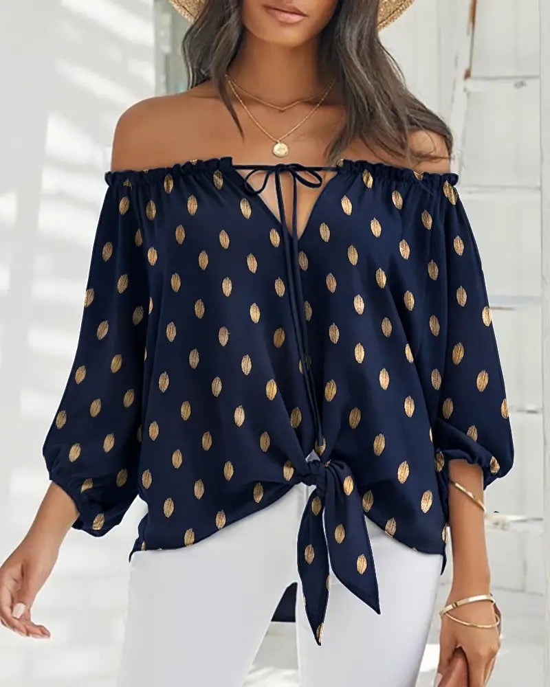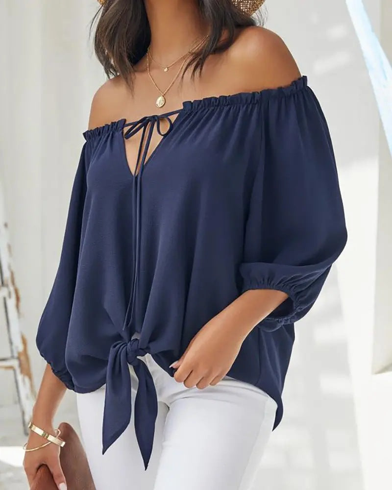 Deze stijlvolle blouse heeft een losvallende pasvorm, met een elegante off-shoulder halslijn en een schattige knoopdetail aan de onderkant, die je figuur op een charmante manier benadrukt. Het is de perfecte keuze voor een casual dagje uit of een zomerse avond. De veelzijdigheid en het luchtige ontwerp maken deze blouse een must-have voor het warmere seizoen. Bestel jouw exemplaar vandaag nog bij Mowa-Mode!